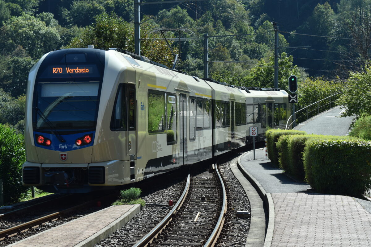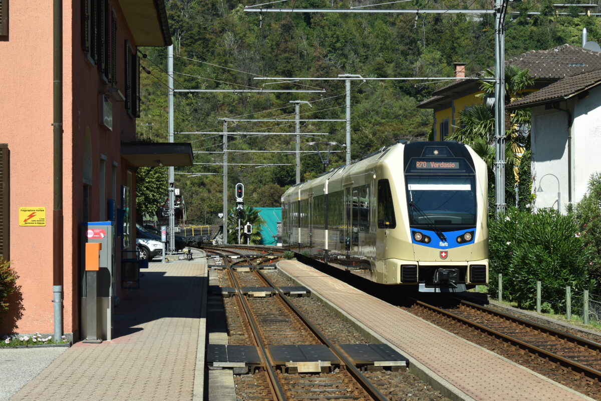 Es ist eine Schmalspurbahn (Spurweite 1000mm); für Normalspur war in diesem engen Tal kein Platz. Der Fahrbetrieb wird von einer regionalen Bahngesellschaft durchgeführt, die den für englische Ohren eher befremdlichen Namen FART trägt. Das steht für “Ferrovie autolinee regionali ticinesi”; wir sind hier ja im Tessin, also wird italienisch gesprochen. Dieser Zug hier, einer der modernen Triebwagen, die hier fahren, verläßt gerade den Bahnhof Intragna. Natürlich pünktlich.
