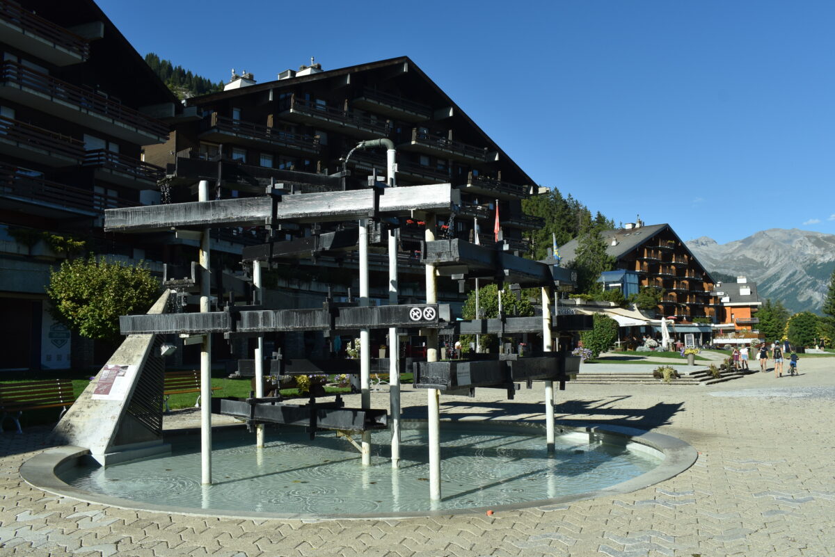 Der Brunnen auf dem Platz soll an die Bisses erinnern, die alten Wasserleitungen, die an vielen Stellen im Wallis, auch hier im Bereich des heutigen Anzère, angelegt wurden. Sie dienten zur Bewässerung und zur Wasserversorgung und existieren teilweise heute noch. Von Anzère aus sind wir damals an der Bisse d’Ayent entlang bis zum Lac de Tseuzier gewandert, über einen Weg, der teilweise durch unbeleuchtete Tunnels ging. Heute würde man das Smartphone zücken und die Taschenlampe anmachen. Damals mußte man, wenn man die Wanderung mäßig gut präpariert angetreten hat, ohne Licht da durch.