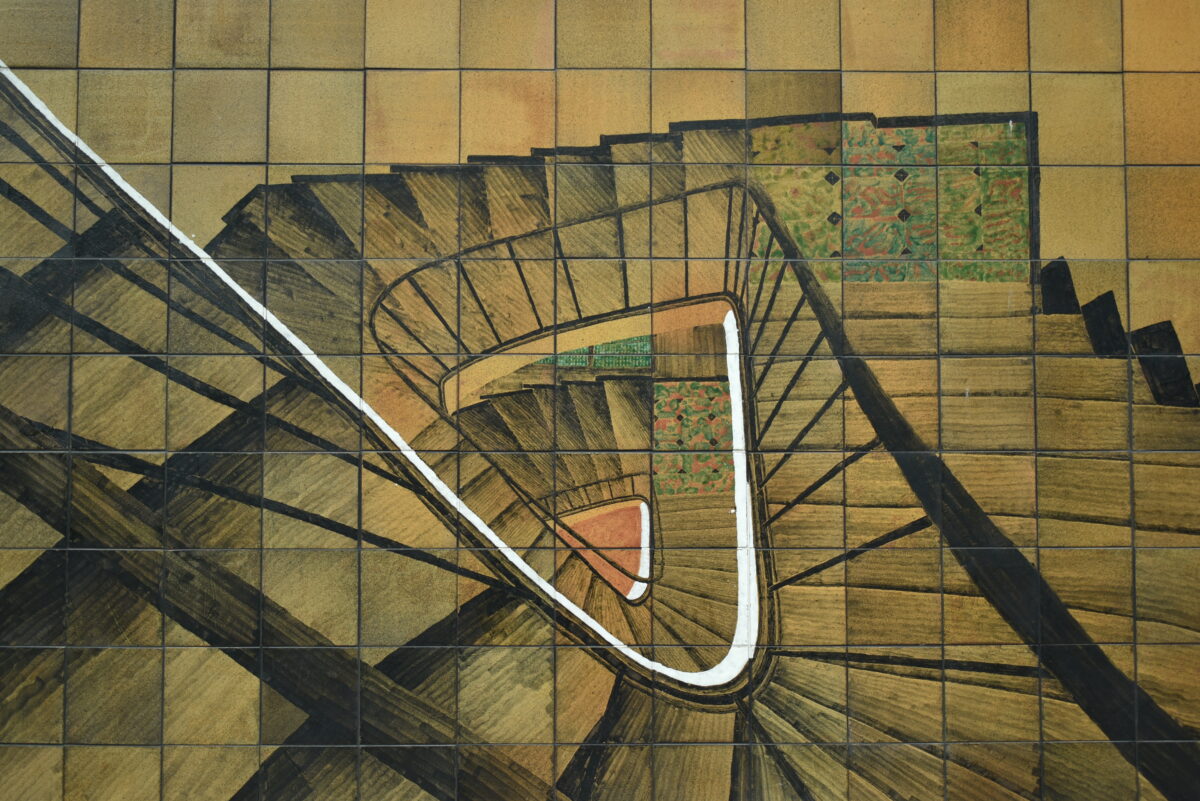 Neben dem fensterlosen Ausstellungsgebäude steht der kleine Pavillon Szafran, an dessen Außenseite ein Werk des Künstlers (Sam Szafran) angebracht ist, das schlicht und treffend “L’Escalier” heißt.