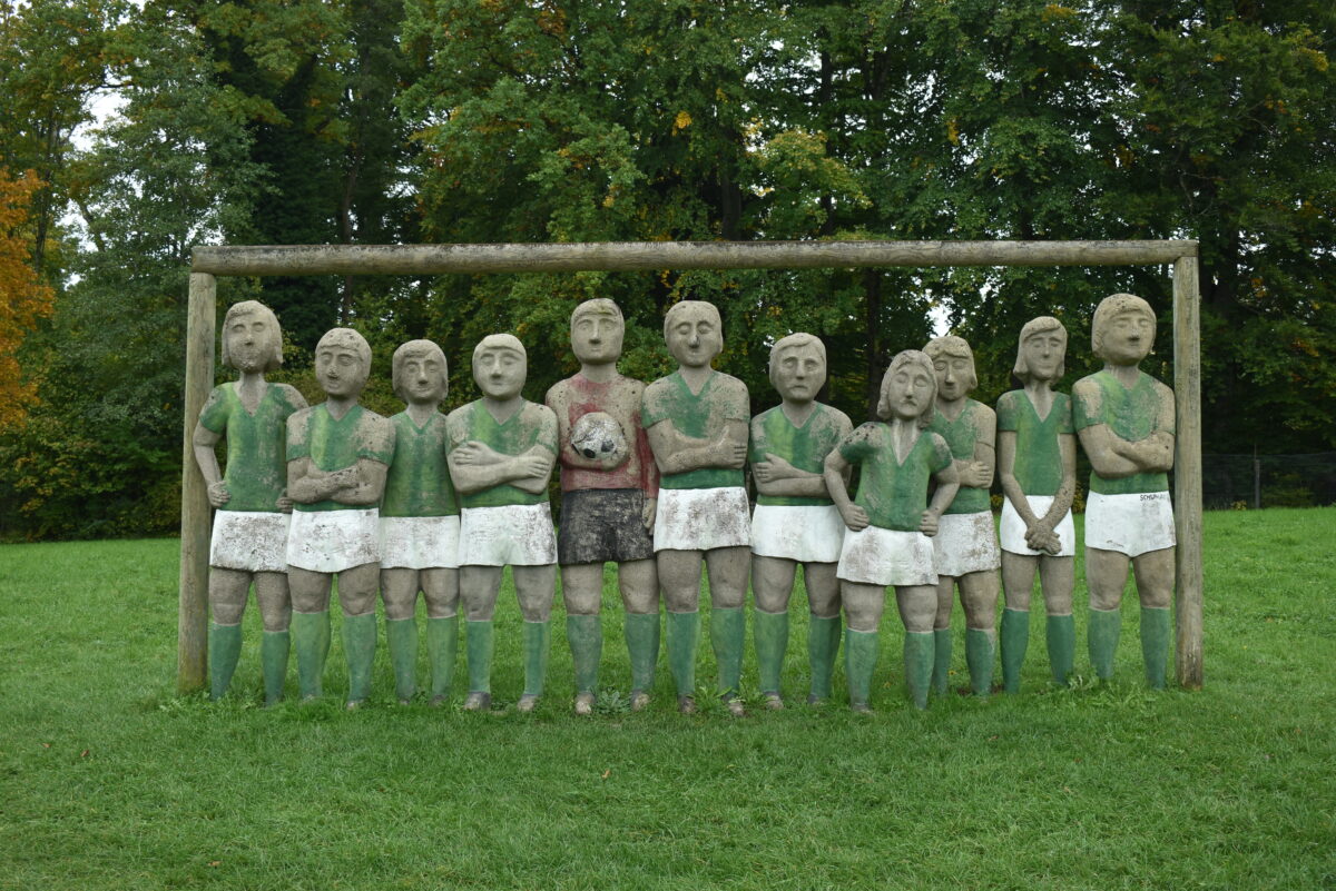 Antwort: Die BSG Chemie Leipzig, die Meistermannschaft von 1964, die als Außenseiter (“Rest von Leipzig”) sensationell den DDR-Meistertitel holen konnte. Das hier ist ein Abguß; die Originalskulptur steht am Alfred-Kunze-Sportpark in Leipzig-Leutzsch.