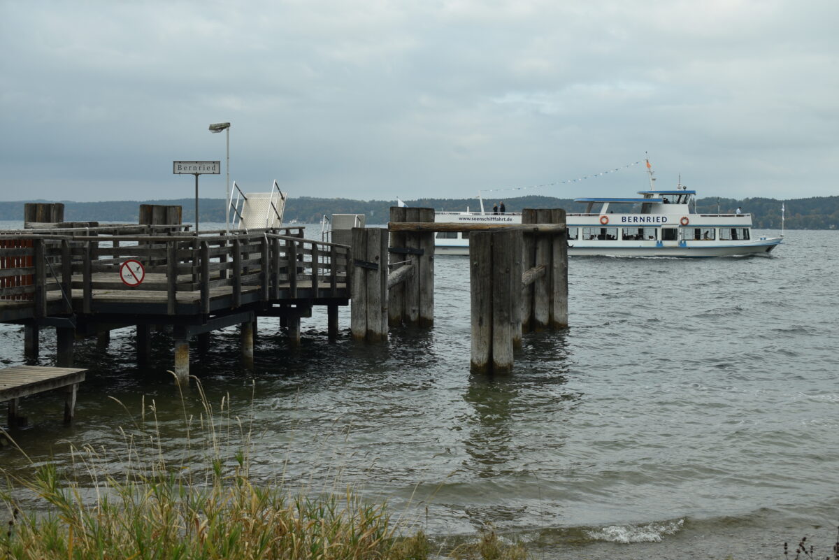 Und natürlich durch die Lage am Seeufer mit einer Anlegestelle. An der auf diesem Bild ausgerechnet die “Bernried” ohne anzuhalten vorbeirauscht: