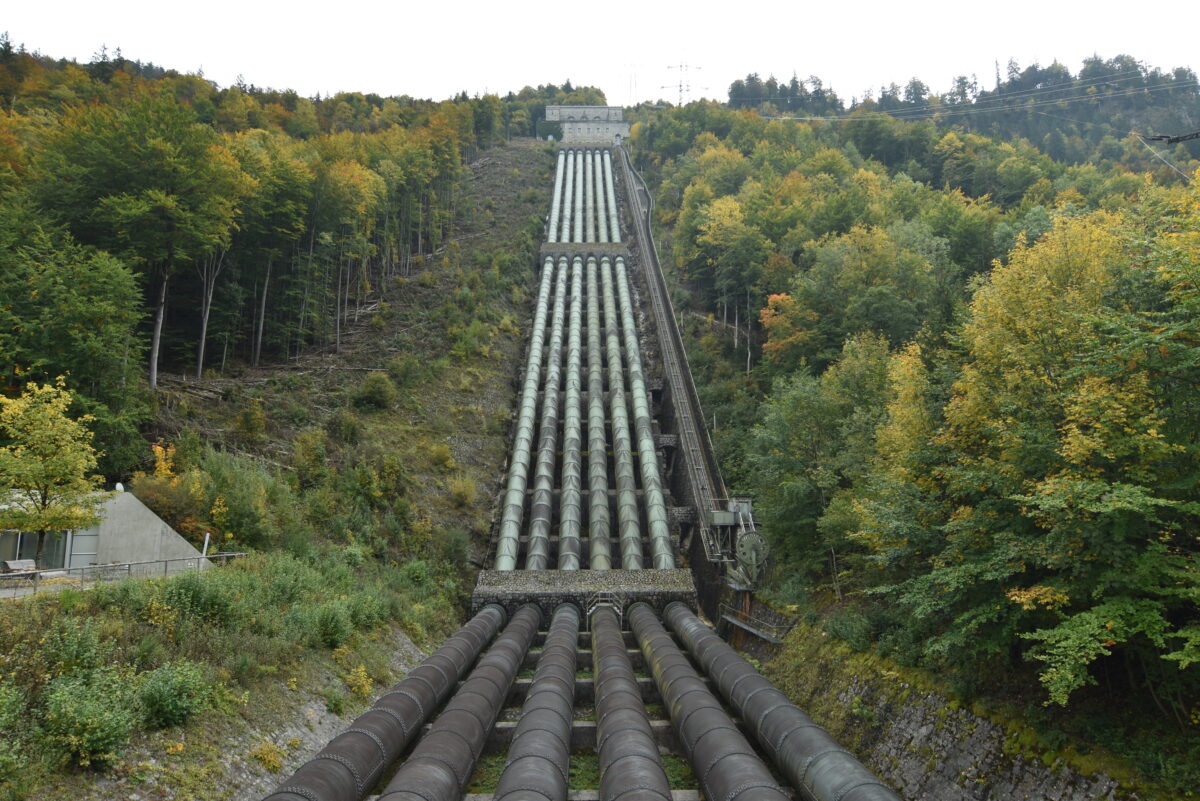 Hier werkeln vier Francis-Turbinen und vier Pelton-Turbinen. In der Bildmitte kann man an dem dunkelgrauen Rad die Drehbewegung erkennen. Das Kraftwerk kann innerhalb von 30 Sekunden hochgefahren werden, kann also jederzeit Strom erzeugen, wenn welcher benötigt wird. Auch bei Windstille.