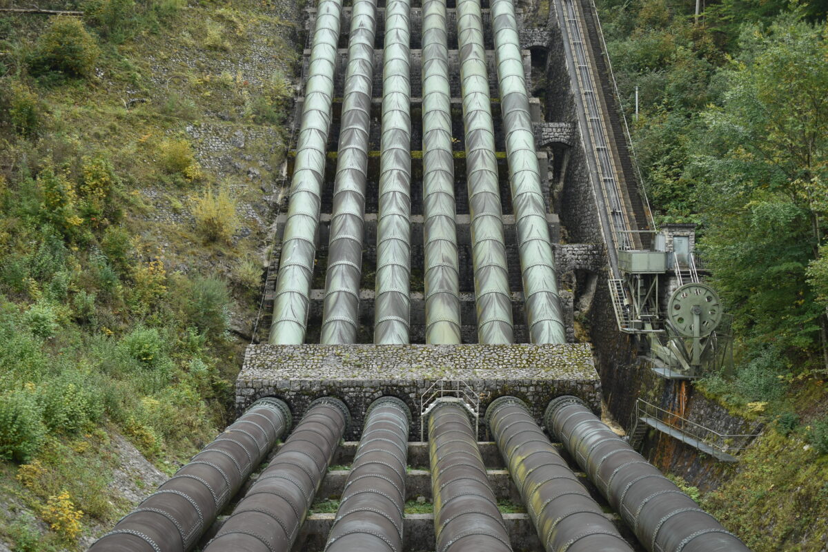 Hier nochmal die sechs Fallrohre, durch die bis zu 84 Kubikmeter Wasser pro Sekunde durch die Kraftwerksturbinen gejagt werden kann. Damit der Walchensee genug Wasser hat, um das Kraftwerk speisen zu können, wird ein Teil des Wassers der Isar sowie ein Großteil des Wassers des Rißbaches über teils weite Strecken (der Rißbachstollen ist mehr als sieben Kilometer lang) in den See geleitet. Über den Kochelsee und die Loisach kommt das Wasser aber später wieder zurück zur Isar.