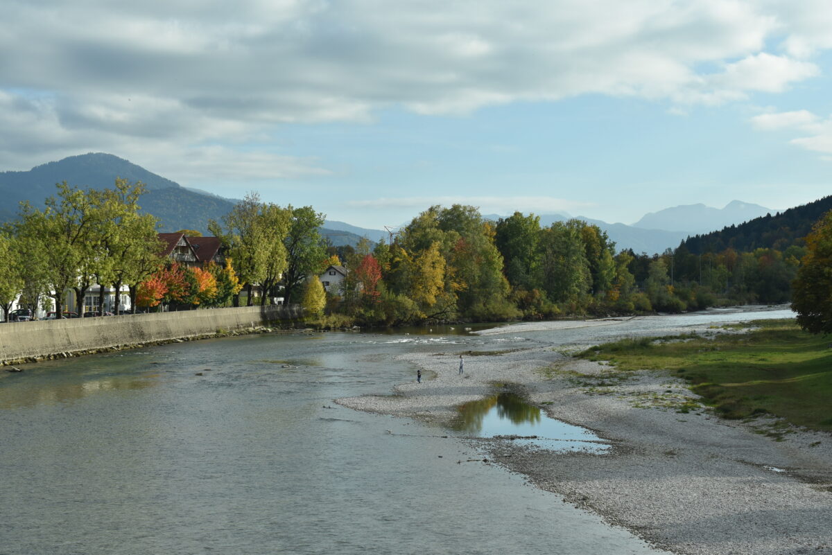 Bad Tölz liegt mit seiner sehenswerten Altstadt an der Isar, die sich hier durch ein breites Tal schlängelt und große Kiesbänke bildet, jedenfalls wenn der Wasserstand vergleichsweise niedrig ist. Auf denen kommt man dem Fluß dann sehr nah, und man hat auch einen schönen Blick auf die Tölzer Altstadt.