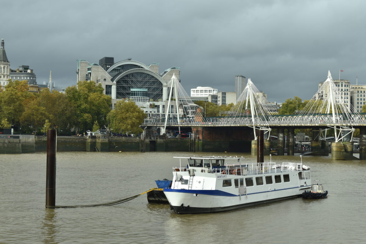 Nebenan führt die Hungerford Bridge über die Themse, flankiert von den Golden Jubilee Bridges, zwei Fußgängerbrücken mit weißen Pylonen und Schrägseilen. Das markante Gebäude dahinter ist das Embankment Plaza, das an den Charing-Cross-Bahnhof angebaut ist.