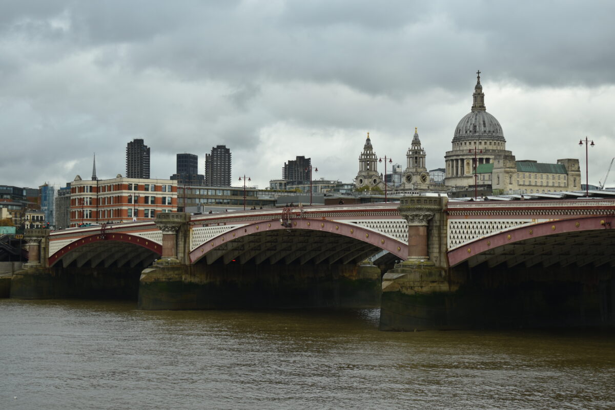 Zum Beispiel die Blackfriars Bridge, eine von mehreren sehr hübschen Bogenbrücken in der Stadt. Rechts dahinter die Kuppel der St. Paul’s Cathedral.