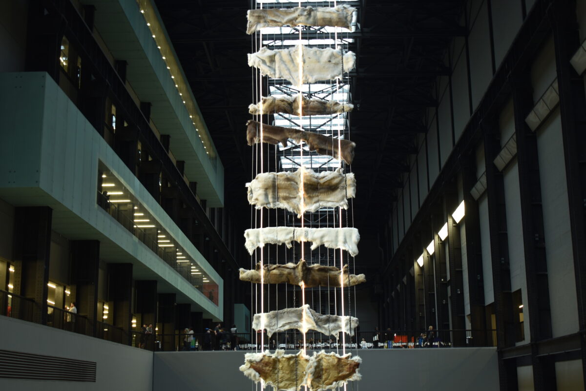 Das Ding in der Mitte ist übrigens ein Kunstwerk. Irgendwas mit Fellen und Häuten. Ich war bei meinem ersten London-Besuch (vor unglaublichen 24 Jahren…) auch schon in der Tate Modern und kann mich noch an einen Konzertflügel erinnern, der an der Decke hing und sich ab und zu,von einer verborgenen Mechanik angetrieben, unter mächtigem Getöse zerlegte und dann wieder zusammengezogen wurde. Das sah dann aus als würde er seine Klaviatur auskotzen. Moderne Kunst. Ob der Flügel noch im Museum hängt, weiß ich nicht. Einmal gesehen reicht; ich war dieses Mal nur in der zentralen Halle. Im Museumsshop gibt’s auch andere moderne Kunst (auf Taschen und T-Shirts).