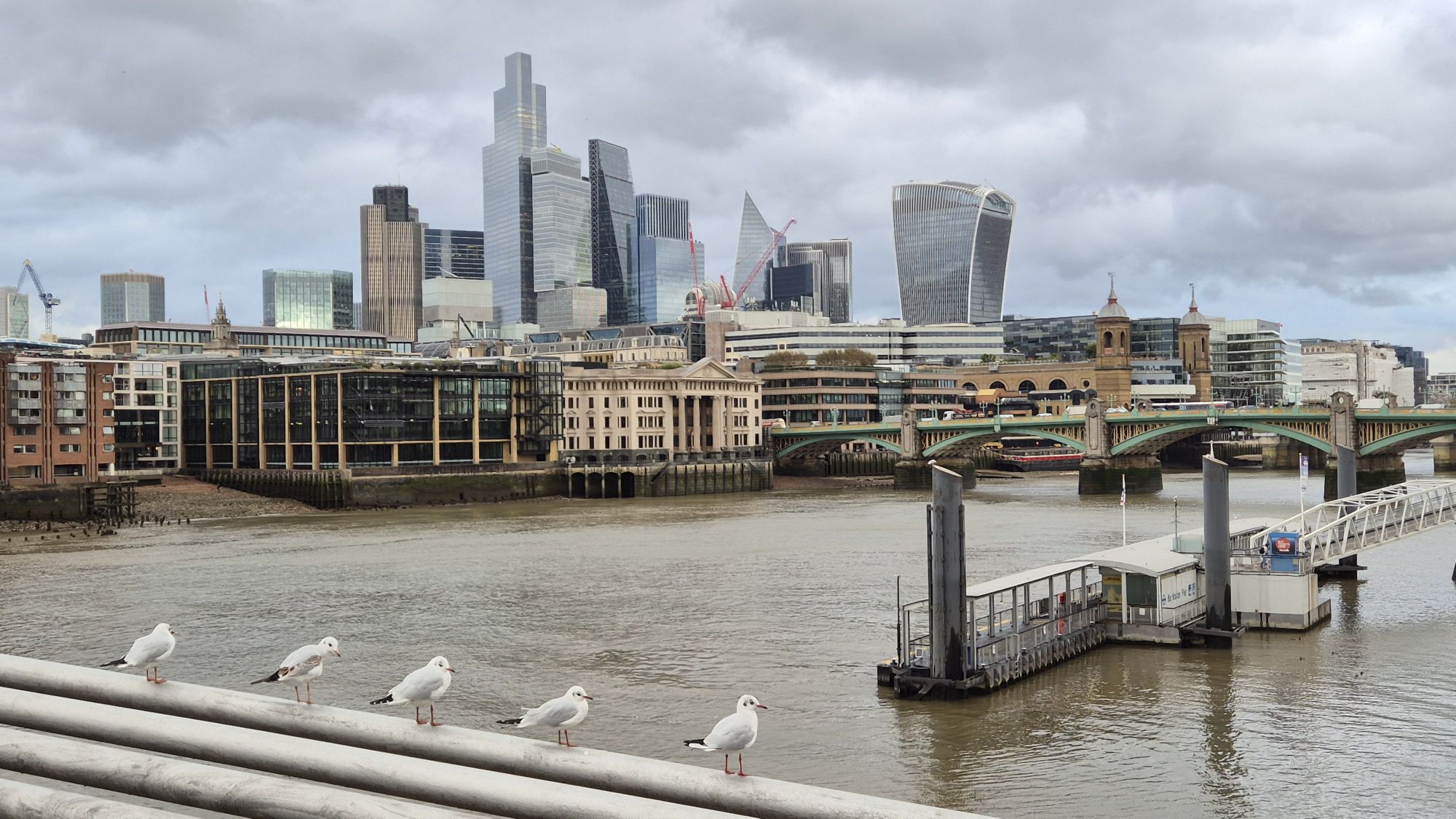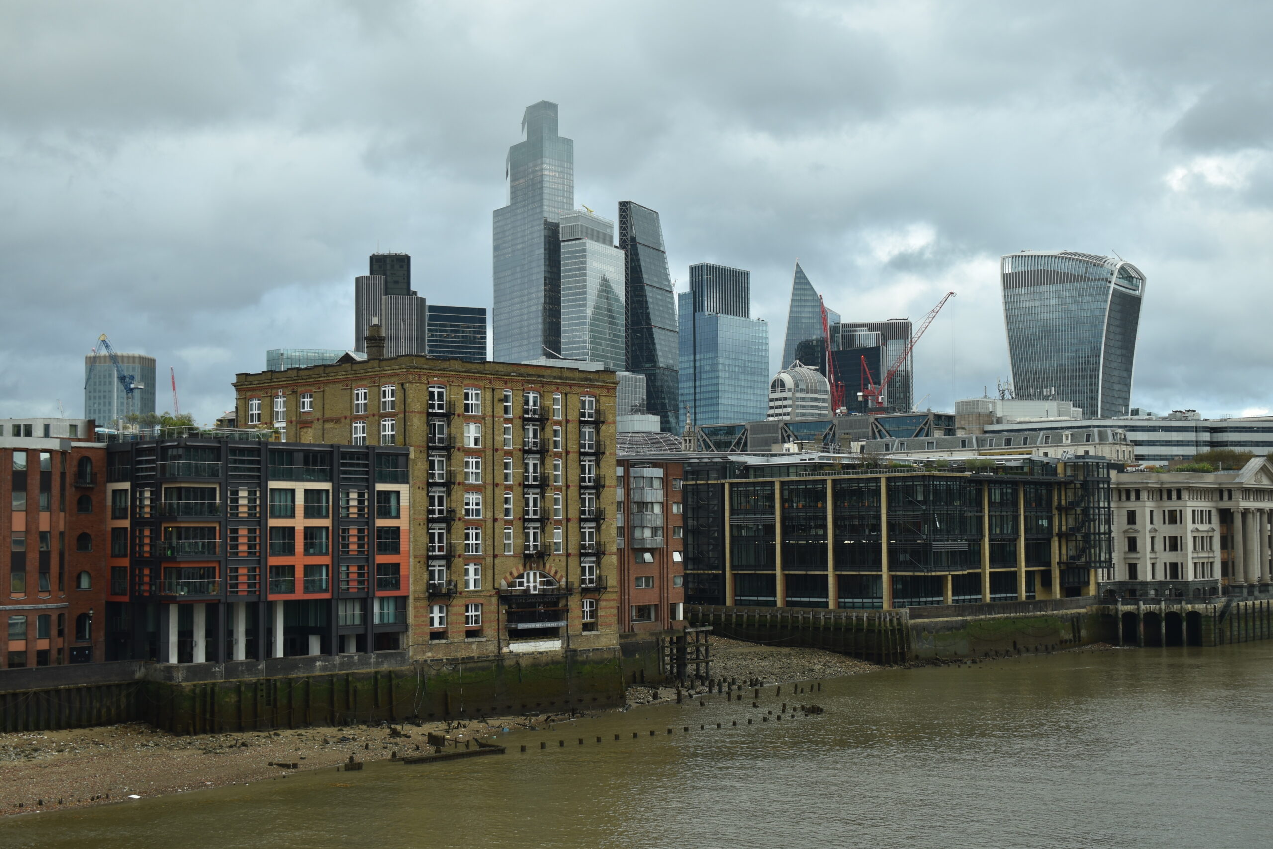 Von der Brücke hat man eine gute Sicht auf die Wolkenkratzer des Londoner Finanzdistrikts. Im Vordergrund läßt der Reisehase hier mal ein paar andere Tiere Platz nehmen. Für ihn wäre das nichts: Zu gefährlich. Und außerdem nicht erreichbar.