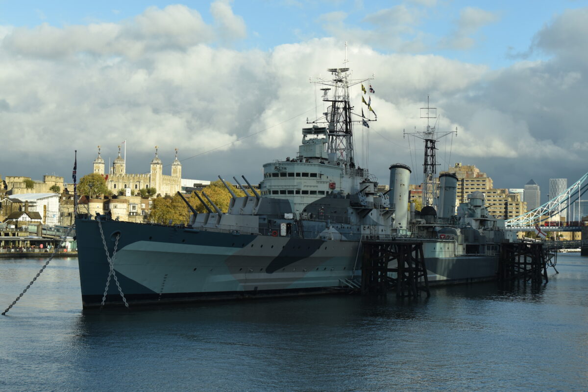 Zwischen London Bridge und Tower Bridge liegt die HMS Belfast, ein 1939 in Dienst gestellter Kreuzer, der seit 1971 als Museumsschiff hier ankert.