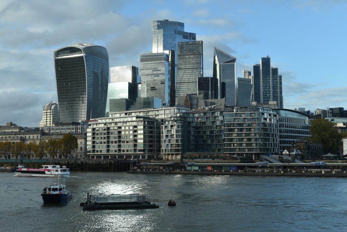 Nochmal einen Blick auf den Finanzdistrikt. Das Gebäude links heißt offiziell 20 Fenchurch Street, erhielt aber den Namen “Walkie-Talkie”, weil es nun mal so aussieht. Die Südseite des Gebäudes funktioniert wie ein Brennglas, bündelt das Sonnenlicht und sorgt für sehr hohe Temperaturen im Brennpunkt. Was man erst nach Fertigstellung feststellte, weil ein paar Autos, die unglücklich genau im Brennpunkt abgestellt waren, angekokelt worden sind. Irgendein Fernsehreporter soll es sogar geschafft haben, auf dem Bürgersteig am Themse-Südufer ein Spiegelei in einer Pfanne zu braten. Weil man aber schon länger nicht mehr gehört hat, daß das Gebäude irgendwas zerbrutzelt hat, scheinen sie das irgendwie entschärft zu haben.