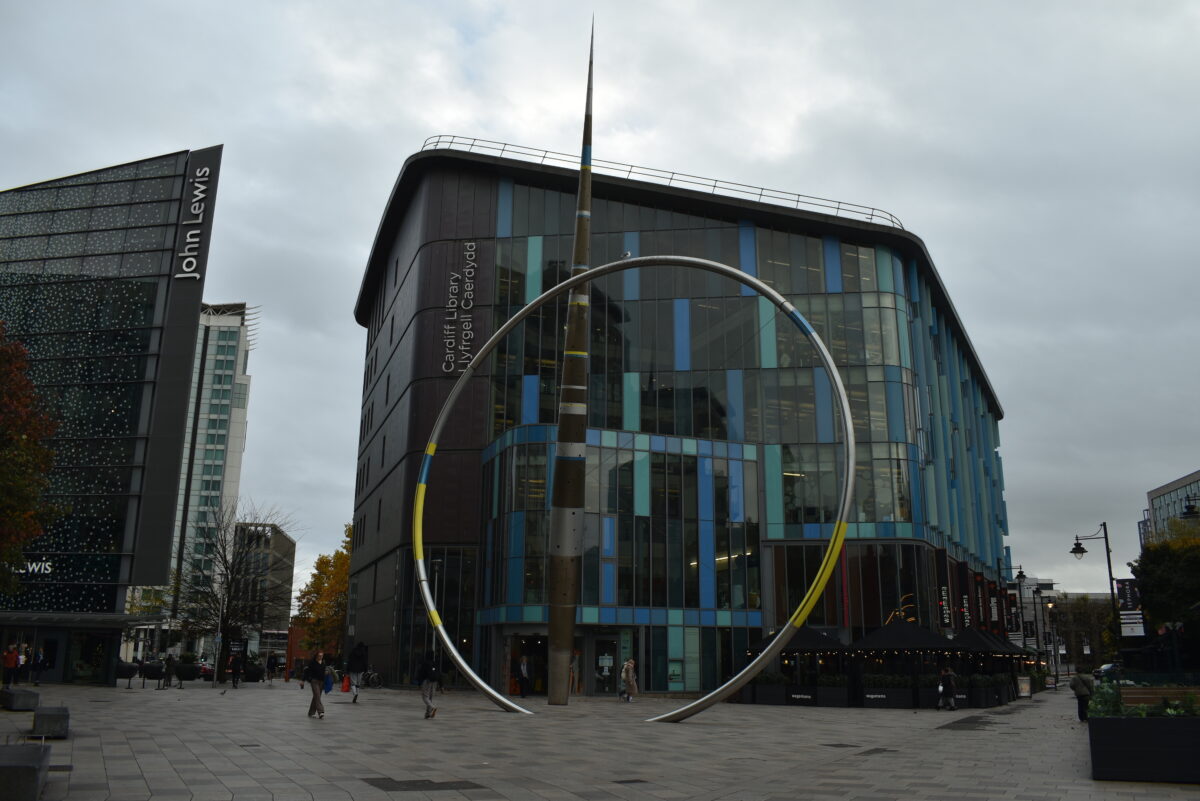 Im Zentrum gibt es auch viele moderne Gebäude, zum Beispiel die Cardiff Library (Llyfrgell Caerdydd). Die Skulptur davor heißt “Alliance”.
