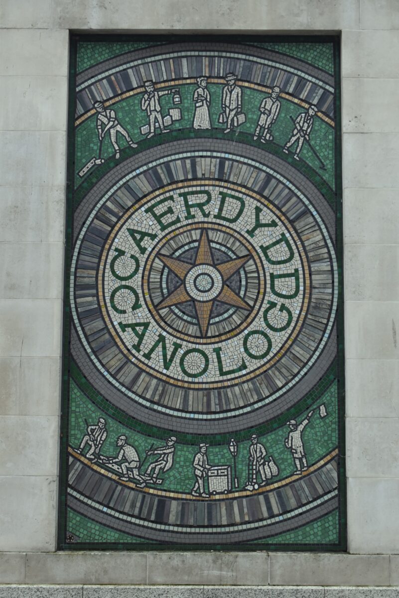 Und man wird hier erstmals mit dem Walisischen konfrontiert, dieser Sprache, die irgendwie noch viel geheimnisvoller wirkt als das Irische, mit viel dd, ll, y und w und weiteren Buchstaben, die alle natürlich ganz anders ausgesprochen werden. Hier zum Beispiel, auf diesem wunderschönen Mosaik, steht der Name des Bahnhofs: Canolog heißt “zentral”, und Caerdydd ist der walisische Name der Stadt, der tatsächlich ungefähr wie Cardiff ausgesprochen wird.