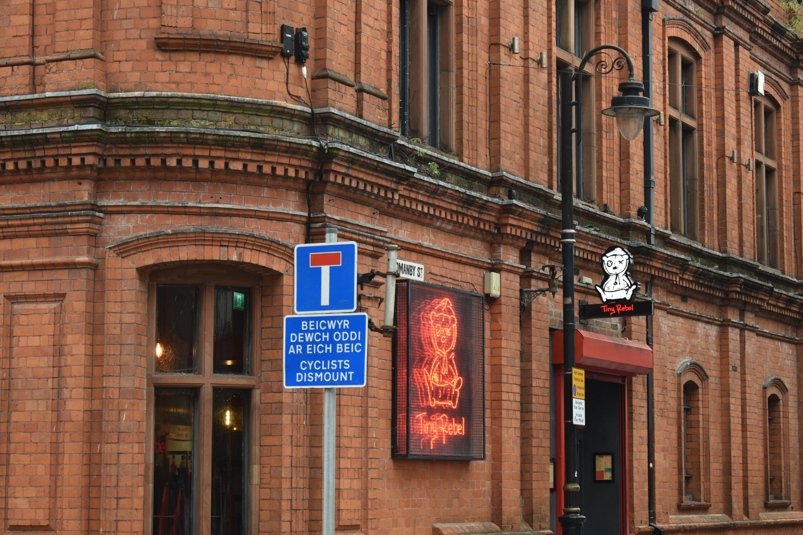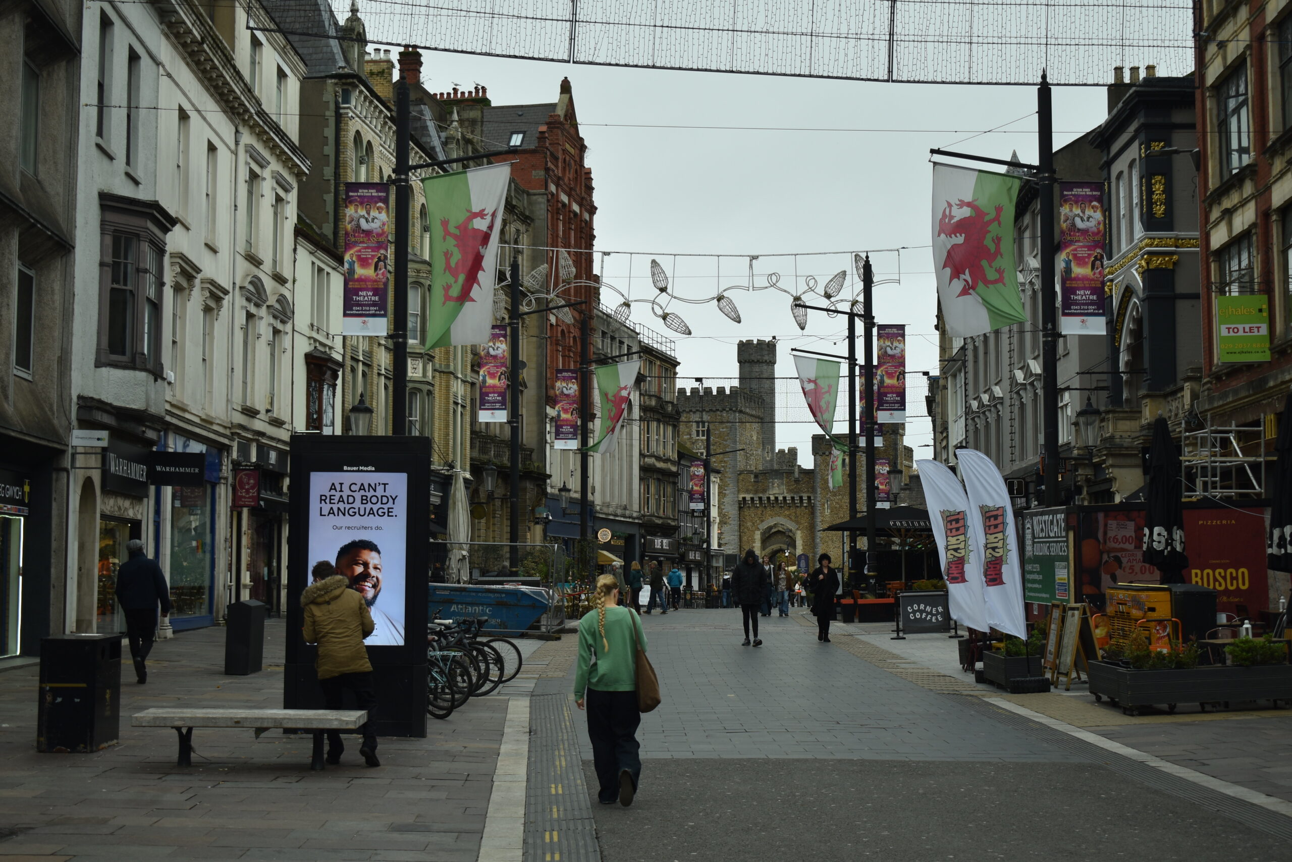 Und man wird hier erstmals mit dem Walisischen konfrontiert, dieser Sprache, die irgendwie noch viel geheimnisvoller wirkt als das Irische, mit viel dd, ll, y und w und weiteren Buchstaben, die alle natürlich ganz anders ausgesprochen werden. Hier zum Beispiel, auf diesem wunderschönen Mosaik, steht der Name des Bahnhofs: Canolog heißt “zentral”, und Caerdydd ist der walisische Name der Stadt, der tatsächlich ungefähr wie Cardiff ausgesprochen wird.