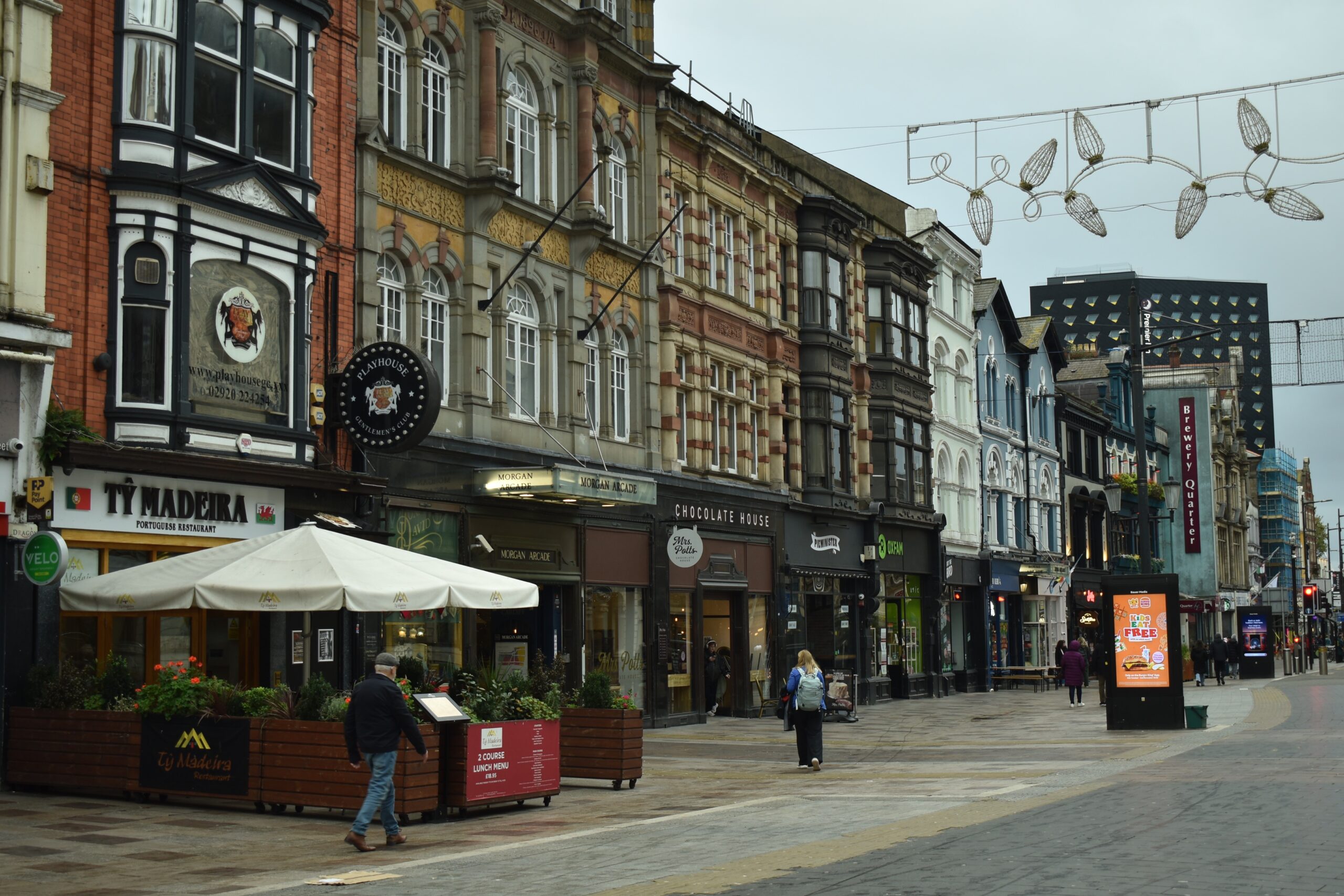 Im Zentrum gibt es auch viele moderne Gebäude, zum Beispiel die Cardiff Library (Llyfrgell Caerdydd). Die Skulptur davor heißt “Alliance”.