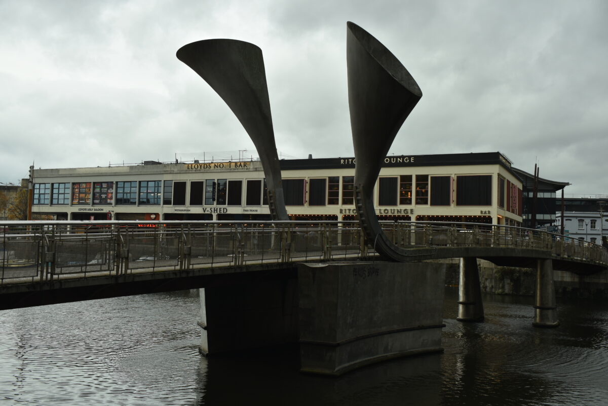 Nahe der Innenstadt ist ein langgestrecktes Hafenbecken, an dem noch einige Güterschuppen stehen, in denen heute Cafés und Bars und andere Läden untergekommen sind. Die riesigen Tröten an der Brücke werden nicht näher erläutert.