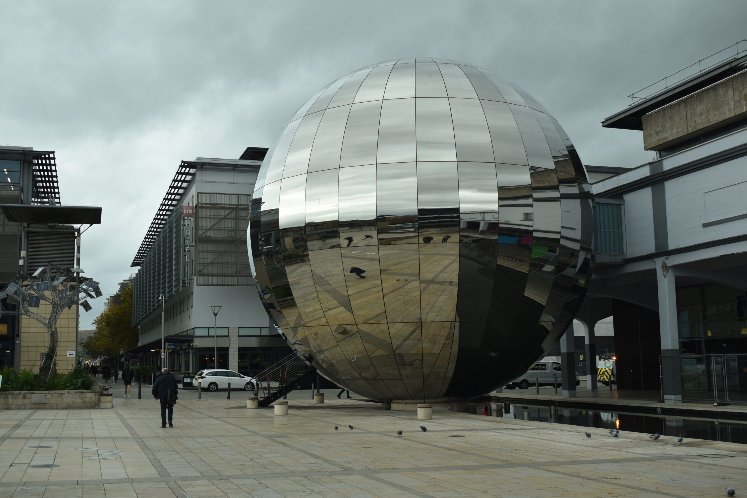 Nebenan liegt der Millennium Square mit einem Ensemble moderner Architektur, unter anderem einer großen Kugel, die schöne Spielereien mit ihren Spiegelungen ermöglicht.