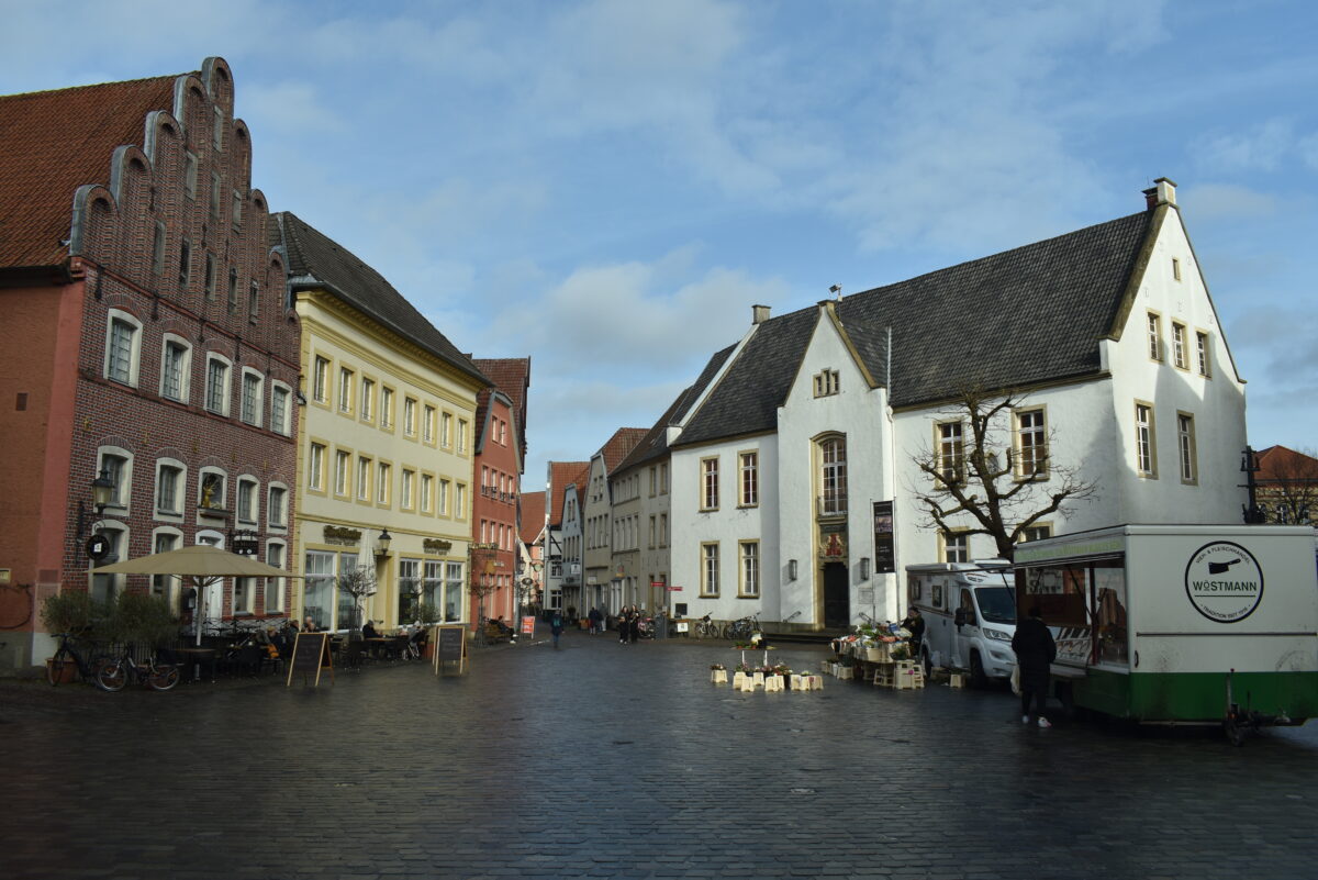 Das Zentrum Warendorfs liegt am linken Ufer der Ems und ist sehr hübsch. Mittelpunkt ist der Marktplatz mit dem historischen Rathaus (rechts).