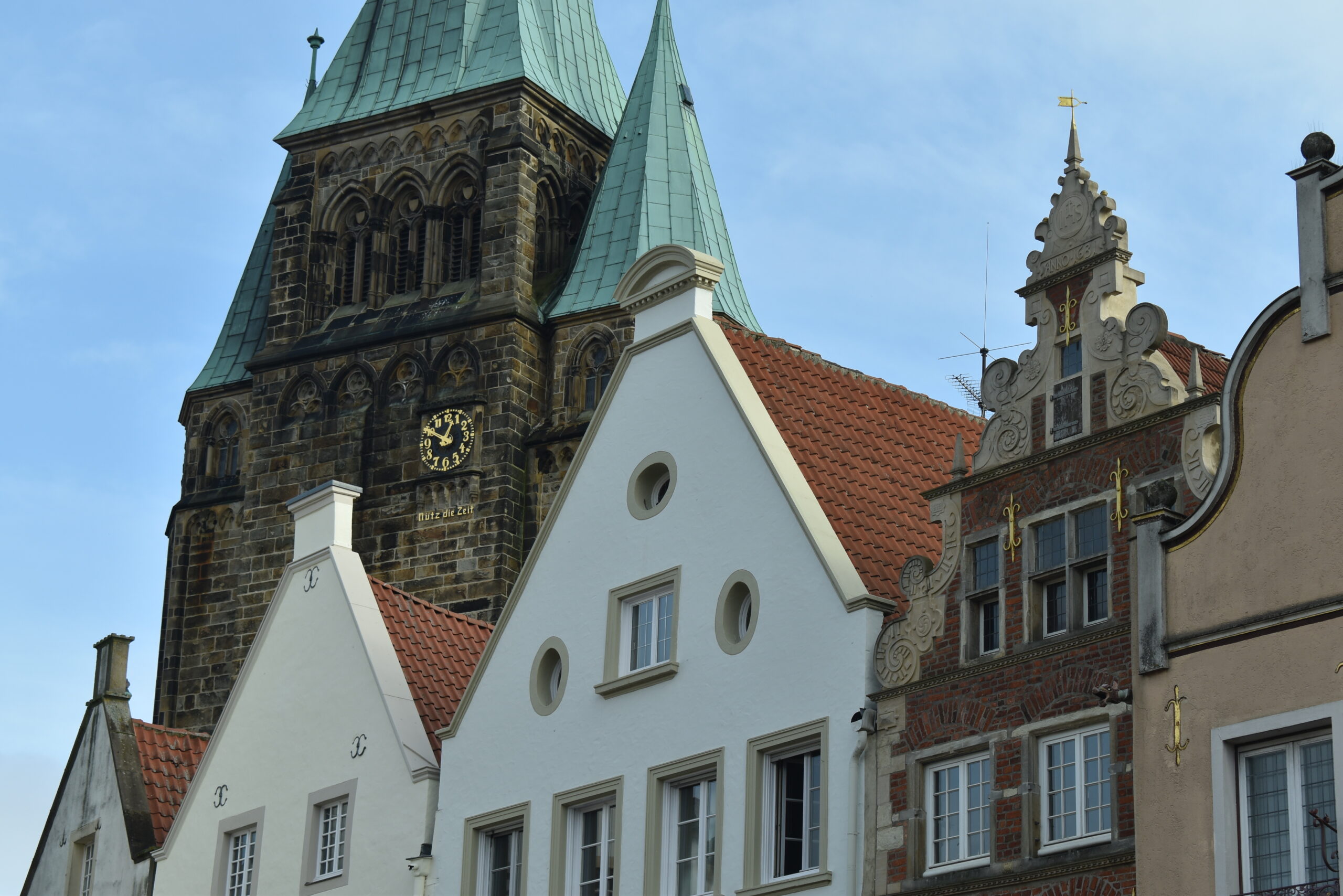 Hinter den Giebeln schaut der Turm der Kirche St. Laurentius hervor.