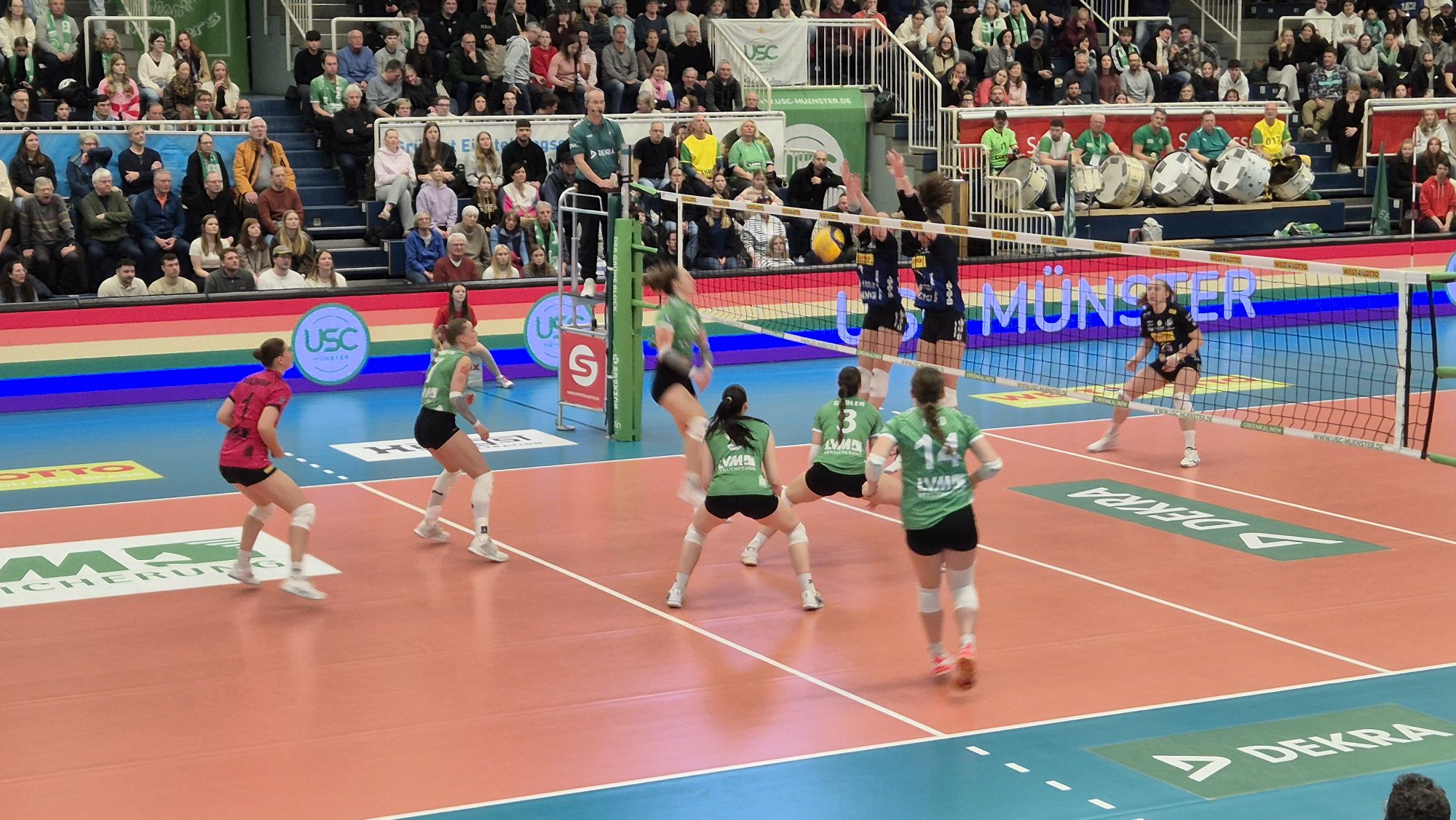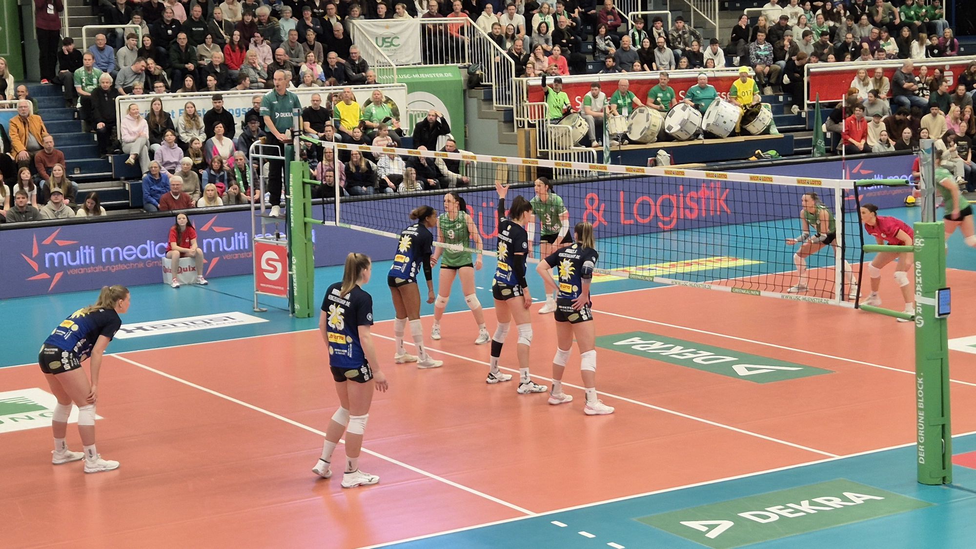 Im heutigen Spiel sind die Suhlerinnen favorisiert, aber Münster gewinnt den ersten Satz deutlich (25:15). Die nächsten drei Sätze gehen dann aber an Suhl, wobei es im vierten Satz hoch hergeht: Zwei, drei strittige Schiedsrichter-Entscheidungen, ein Platzverweis für den Suhler Trainer sowie Rangeleien in den Katakomben. Da wird’s dann richtig laut in der Halle.