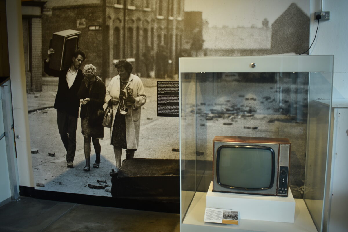 Natürlich ist auch der nordirische Bürgerkrieg ein großes Thema. Eines der bekannten Photos aus dieser düsteren Zeit zeigt eine Familie aus der von Katholiken bewohnten Bombay Road in Belfast, die 1969 durch Loyalisten niedergebrannt und zerstört wurde. Viele konnte nur einige wenige Dinge retten, zum Beispiel den Fernseher. Das Originalgerät vom Photo hat nicht nur den Bürgerkrieg überstanden, sondern auch den Weg ins Museum gefunden.