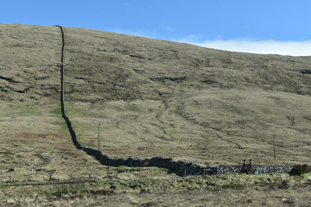 Der Mourne Wall hat heute ein paar Lücken, verläuft aber immer noch auf weiten Strecken schnurgerade durchs Gebirge.