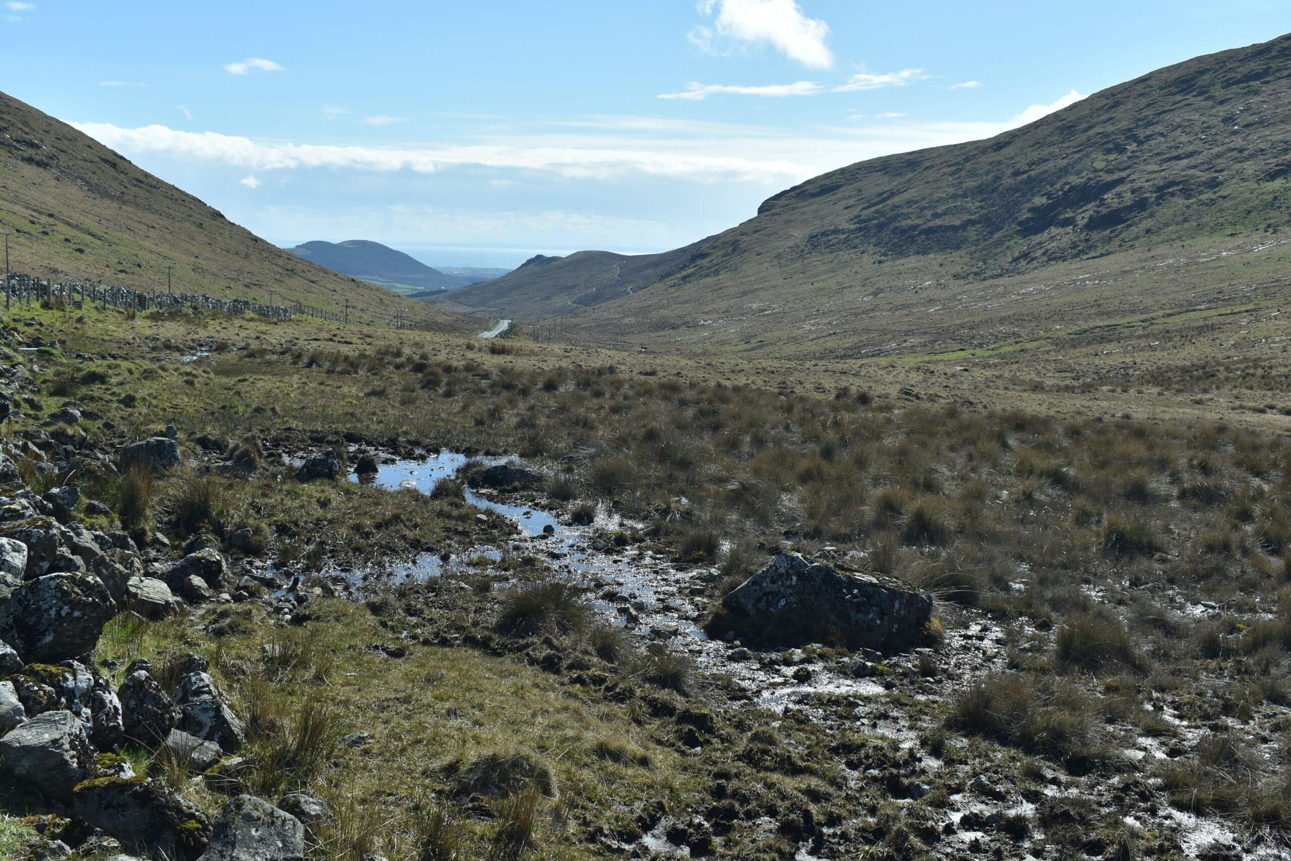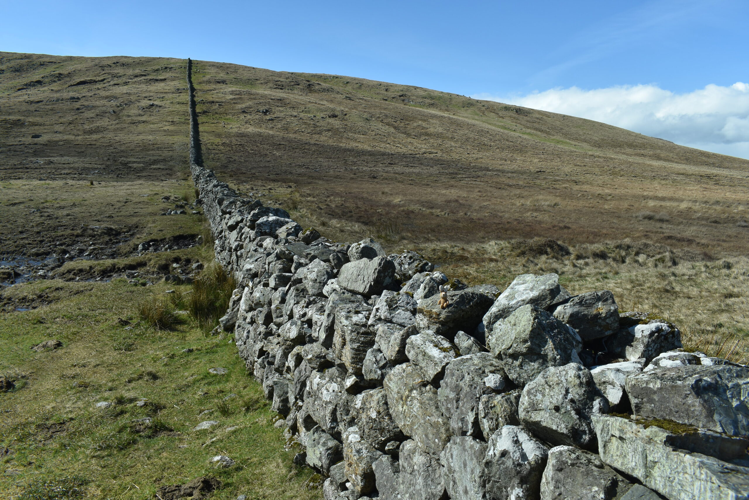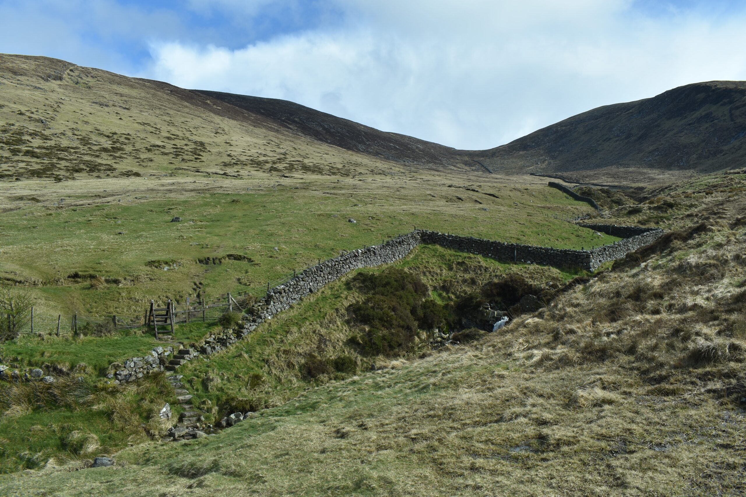 Man kann also an ganz verschiedenen Stellen auf diese lange Mauer stoßen. Die Wanderwege, von denen es in den Mournes einige gibt, führen daran entlang und manchmal auch darüber hinweg.