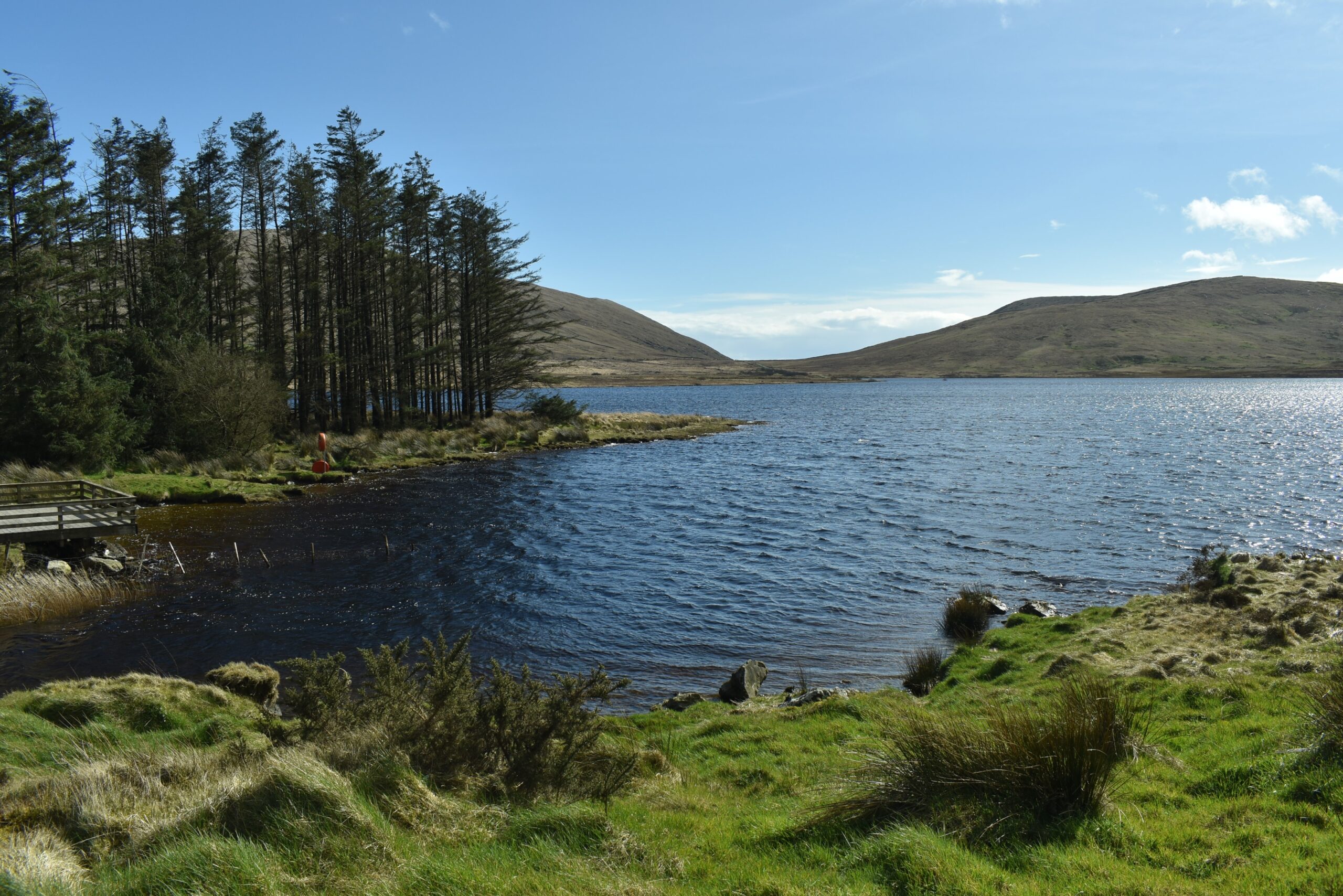 Blick aus den Bergen nach Süden in Richtung Küste: In den Senken liegen häufig Moore. Die gesamte Bergregion ist ziemlich unwirtlich und daher auch nahezu unbesiedelt.