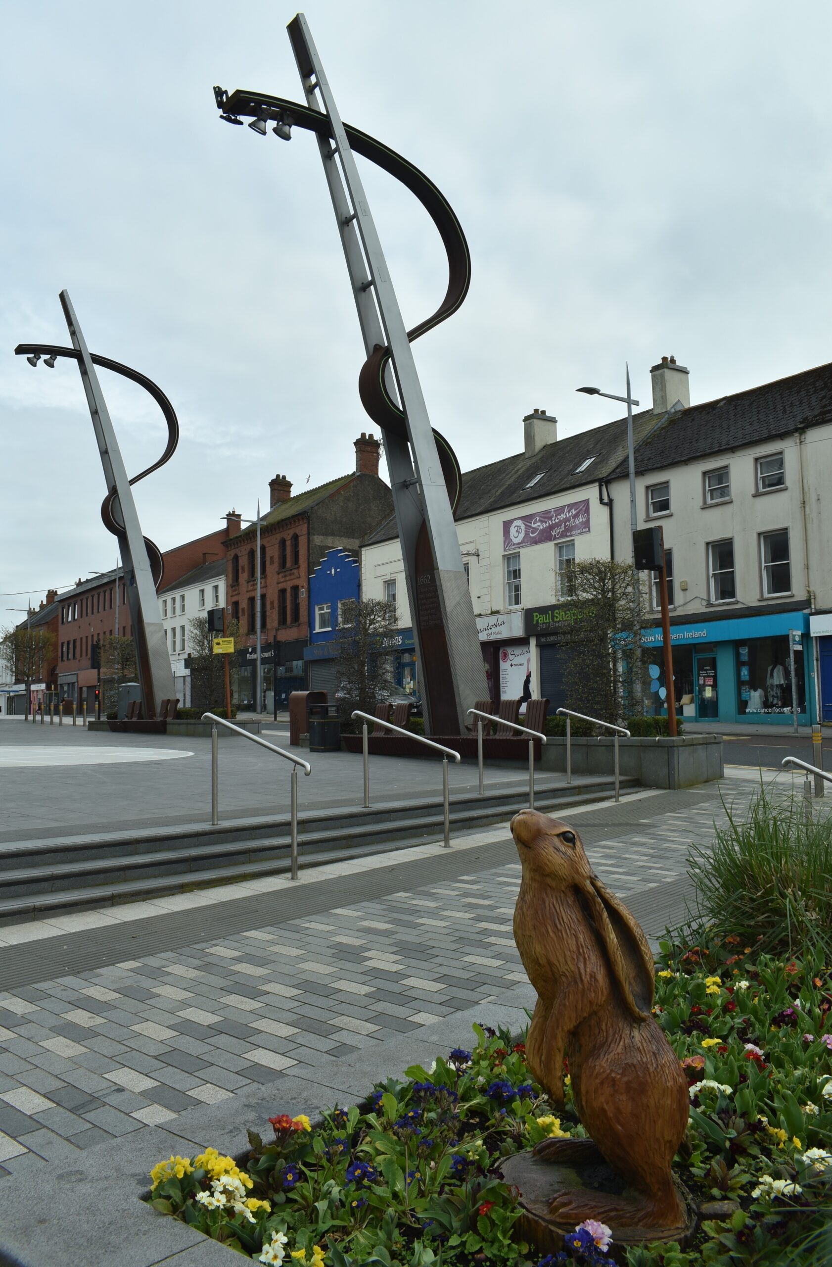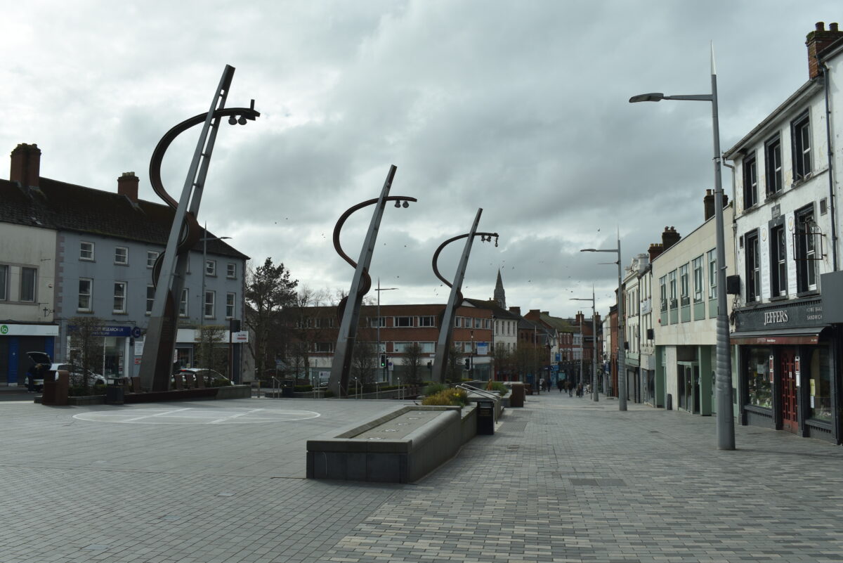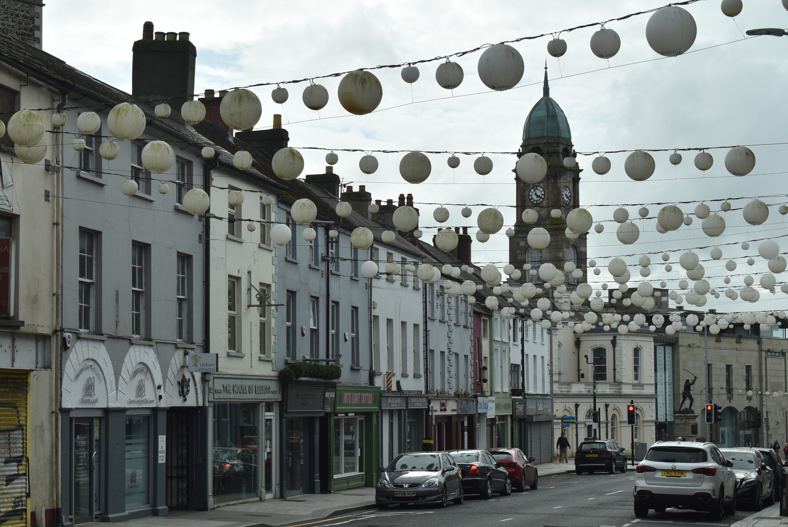 Lisburn war nämlich im 19. Jahrhundert das Zentrum der Textilindustrie in Irland. Die Stadtmitte bildet der dreieckige Marktplatz, von dem die Castle Street (Bild unten) und die Bridge Street nach Osten und die Bow Street nach Westen abgehen.