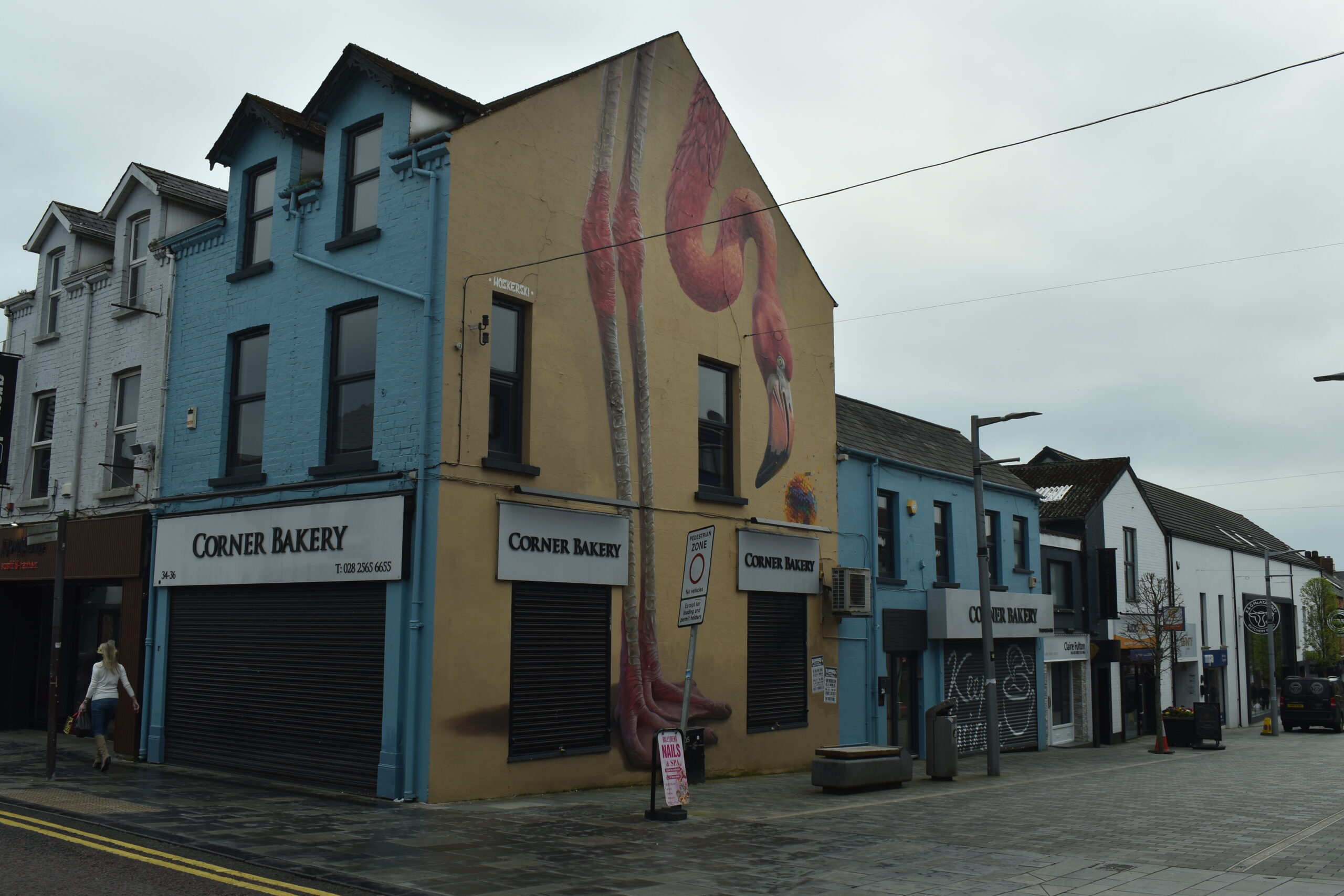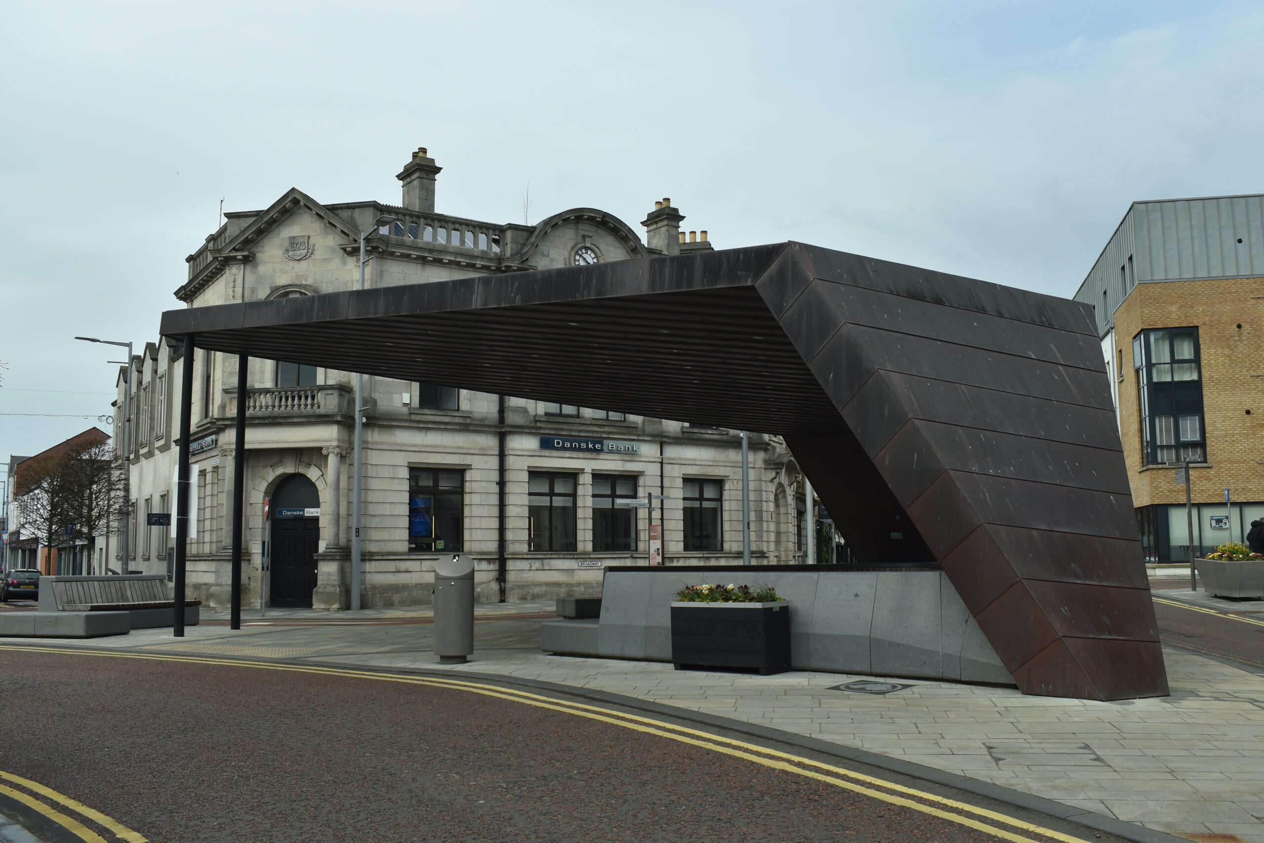 Der hiesige Broadway ist aber lediglich eine normale Innenstadtstraße, die in den Platz aus dem Startbild mündet. Auf dem Platz stehen ein paar Sitzgelegenheiten und die mächtige Überdachung, die als Bandstand dient, allerdings nur einen Teil der Sitzgelegenheiten überdacht. Ballymena hat aber tatsächlich schon Stars erlebt, die durchaus auch Broadway-tauglich waren: Rory Gallagher war hier, Roy Orbison auch, und sogar Pink Floyd und die Rolling Stones haben in Ballymena gespielt, im Flamingo Ballroom in der an den Platz angrenzenden Ballymoney Street. Den Club gibt es schon lange nicht mehr, aber vielleicht in Erinnerung daran ziert eine der Häuserwände in der Straße ein riesiger Flamingo.