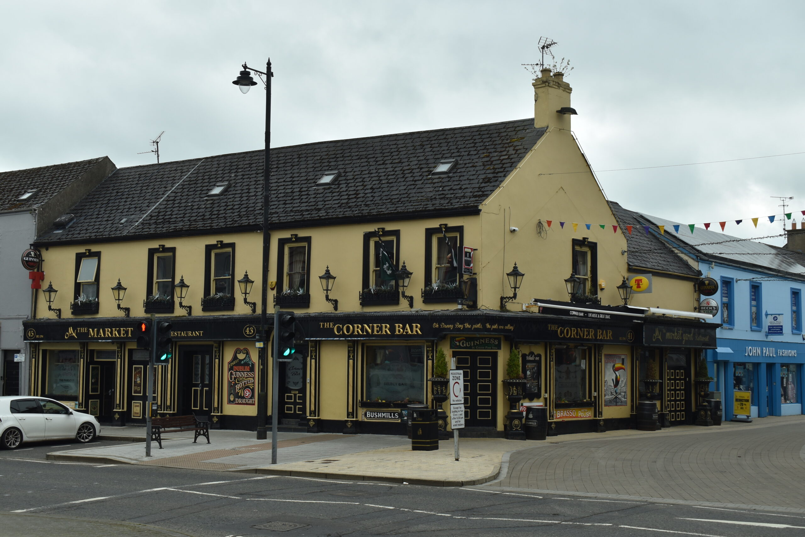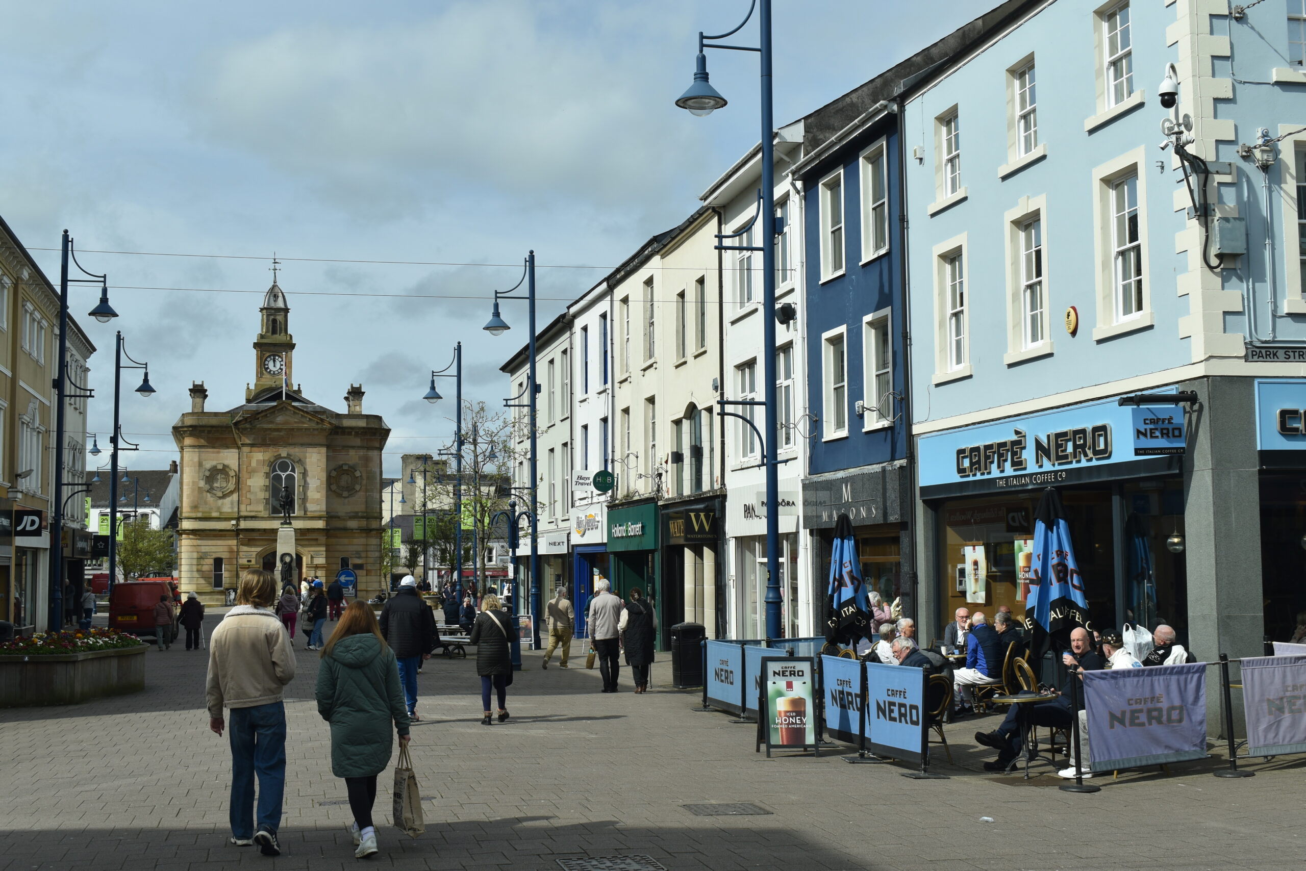 The Diamond und die angrenzenden Straßen sind Fußgängerzone und mit ihren Cafés und Geschäften sehr einladend. Man kann sogar draußen sitzen; die Möglichkeit hatte mir in Drogheda gefehlt.