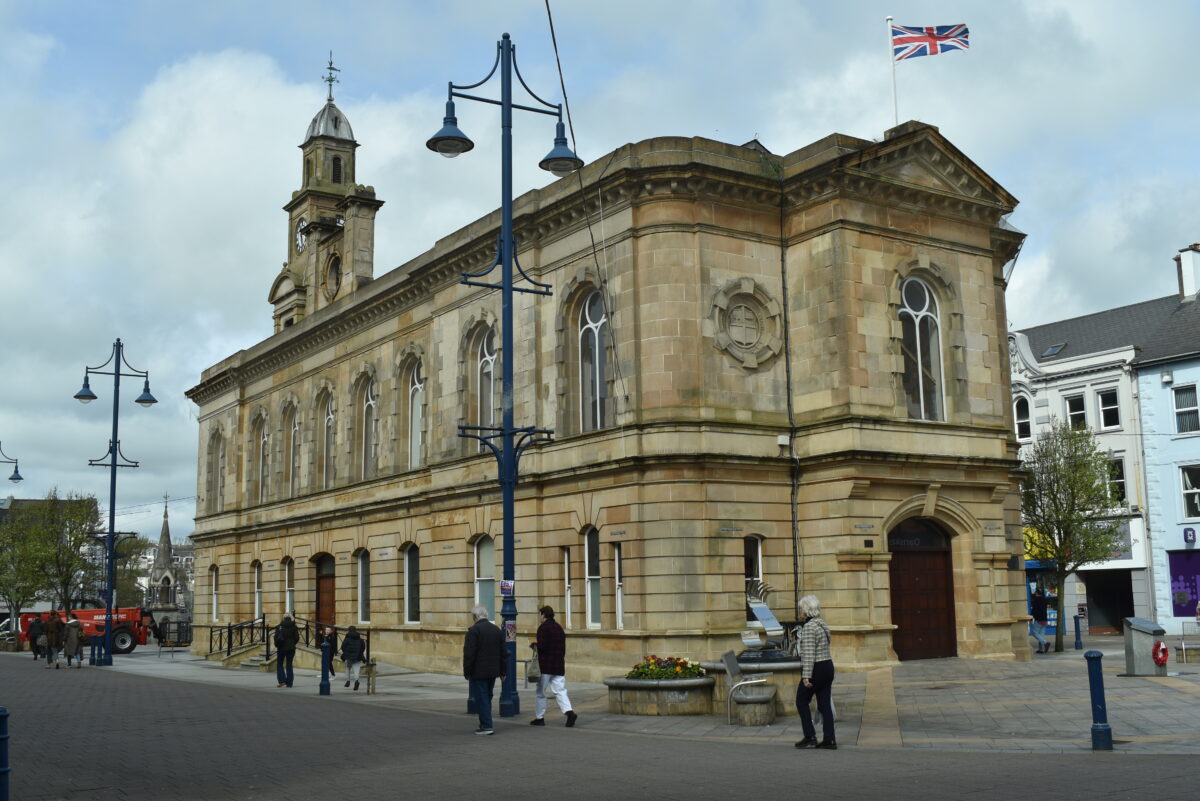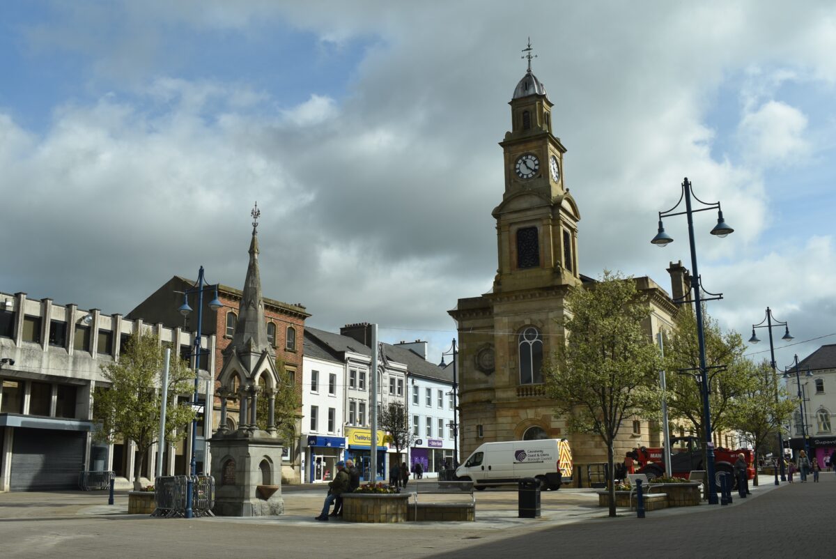 Das Gebäude in der Mitte des Platzes sieht zwar aus wie eine Kirche, ist aber das Rathaus der Stadt. Eigentlich könnte Coleraine seinen zentralen Platz also auch Ring nennen, wie die Städte in Schlesien, wo das Rathaus ja auch oft mitten auf dem Hauptplatz steht und von Bürgerhäusern umgeben ist.