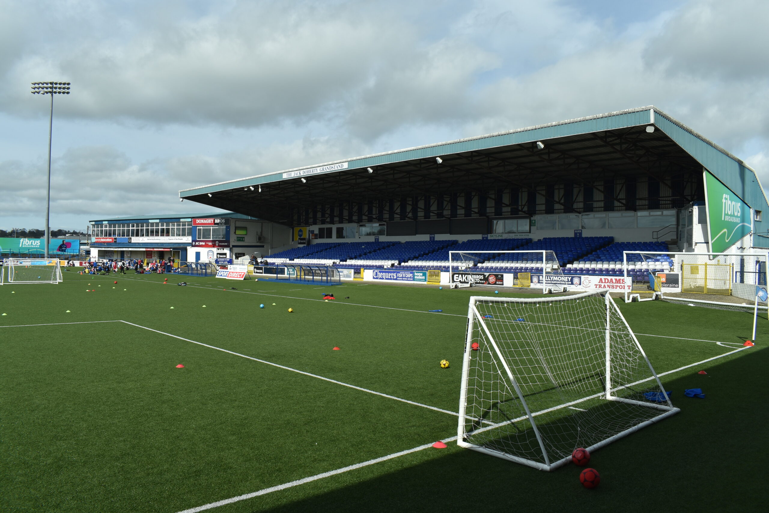 Kleiner Abstecher zum Fußball: Der Coleraine F.C. spielt in der ersten nordirischen Liga, und ins Stadion kann man, weil die Tore offenstehen, einfach so reinspazieren. Es liegt direkt neben dem Bahnhof und heißt The Showgrounds, ein Name, den es auch in anderen irischen Städten gibt (zum Beispiel in Newry, Ballymena oder – in der Republik – Sligo) und sich auf Ausstellungs- und Messeflächen bezieht. Das Stadion wurde bereits 1907 eröffnet, als es den heutigen Coleraine F.C. noch gar nicht gab. Ebensowenig übrigens wie den Kunstrasen, der heutzutage verlegt ist und für den der Stadionronantiker einen Punkt abziehen muß.