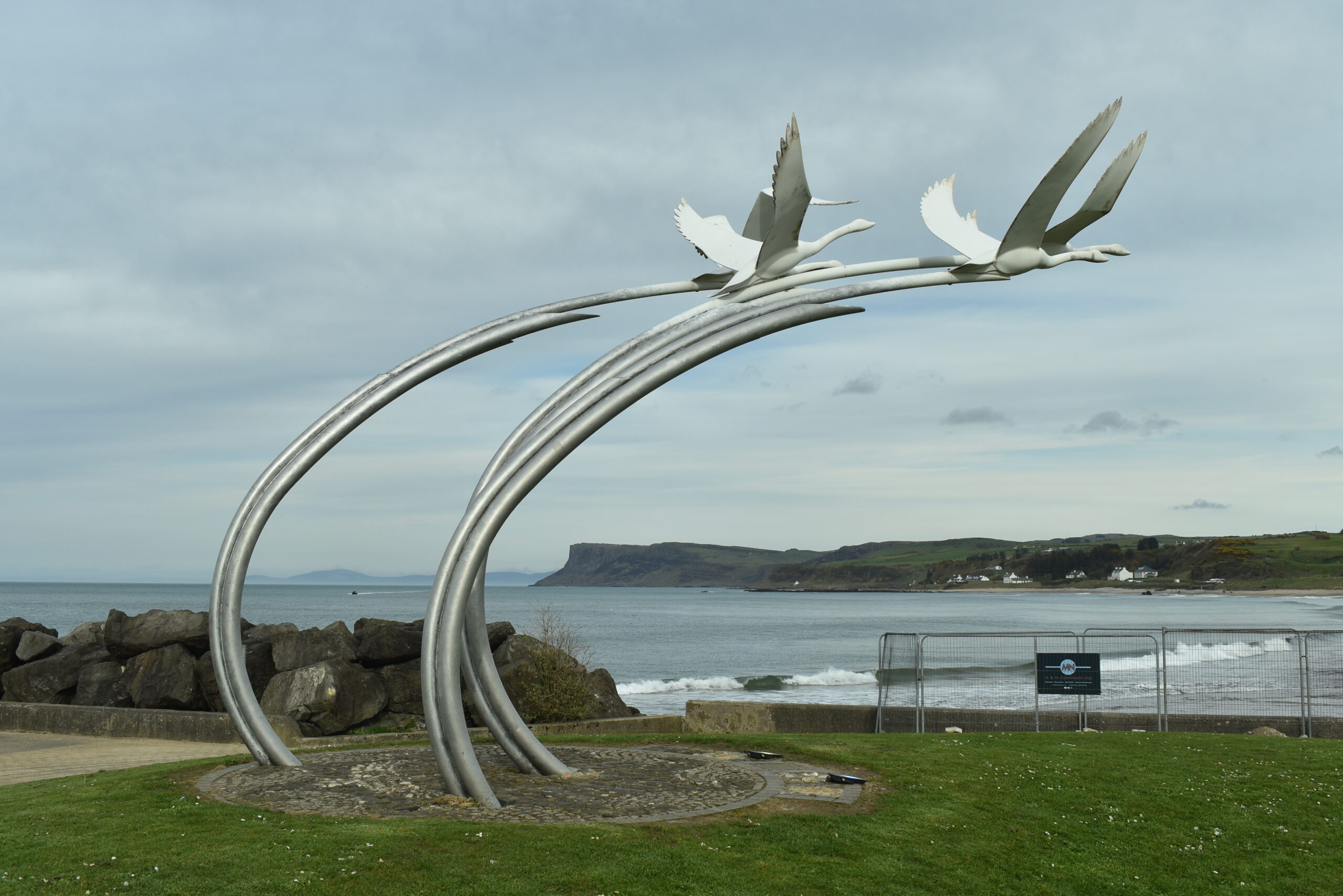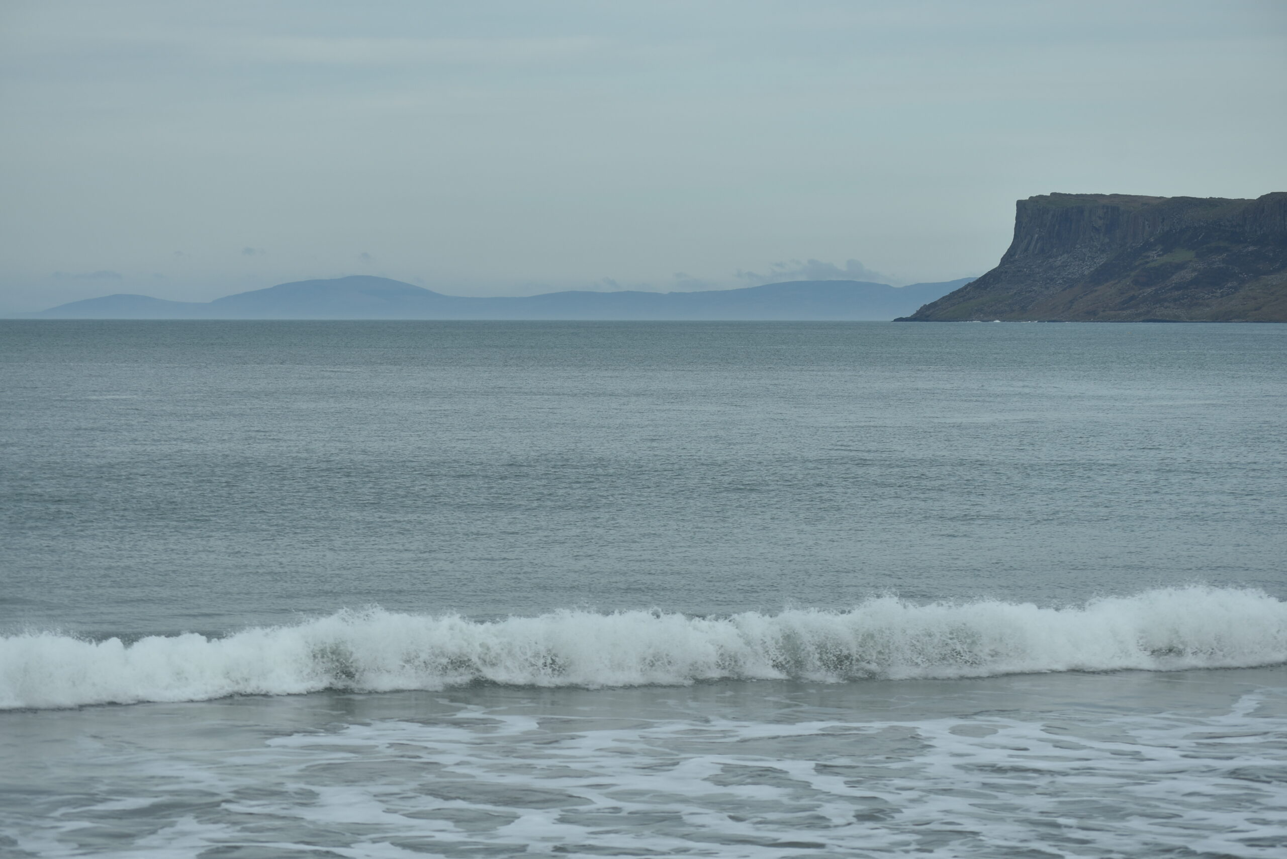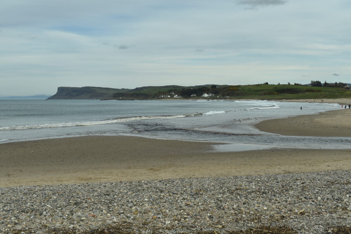 Der markante dunkle Felsen rechts ist Fair Head, der die Bucht von Ballycastle nach Osten abschließt. Und die Berge dahinter sind… der Mull of Kintyre! Von Paul McCartney und den Wings besungen. Schottland ist hier nur noch knapp 25km entfernt.