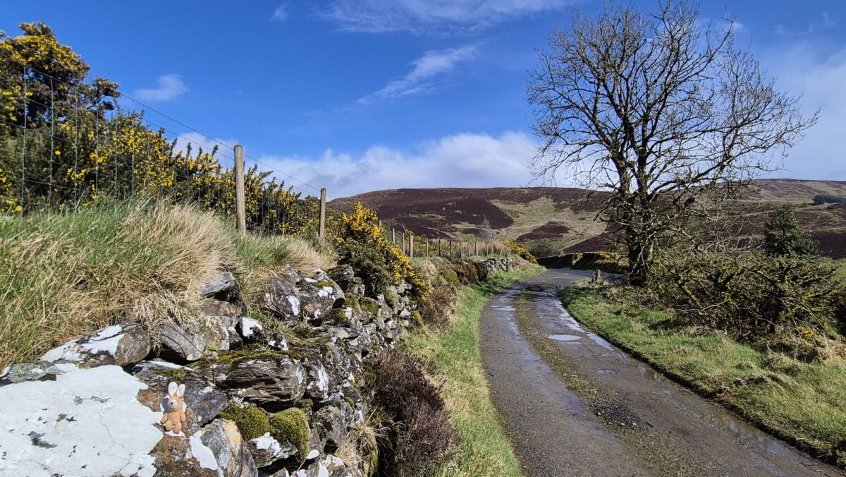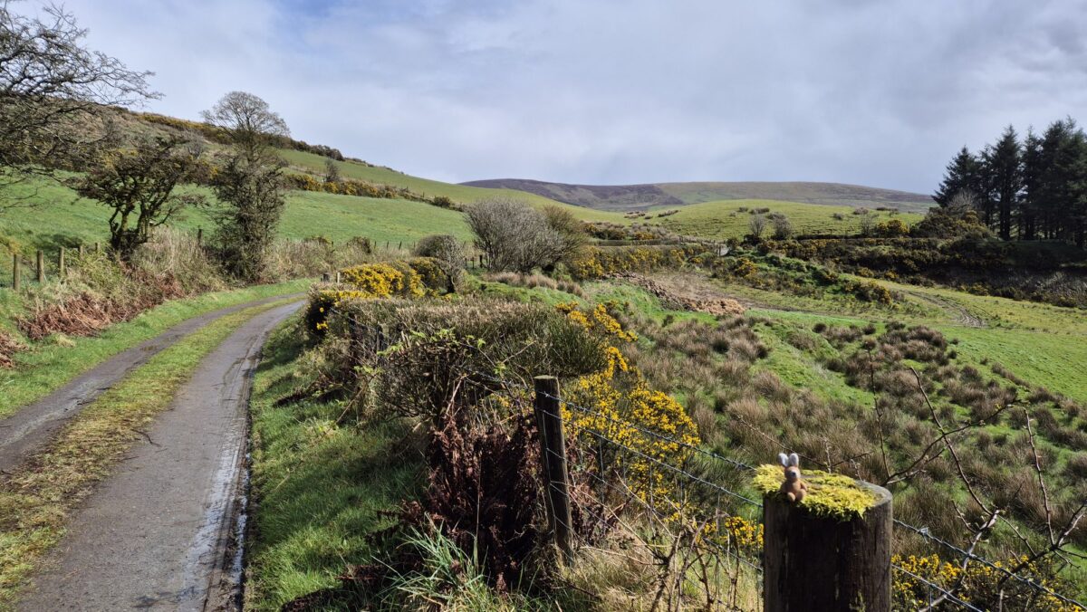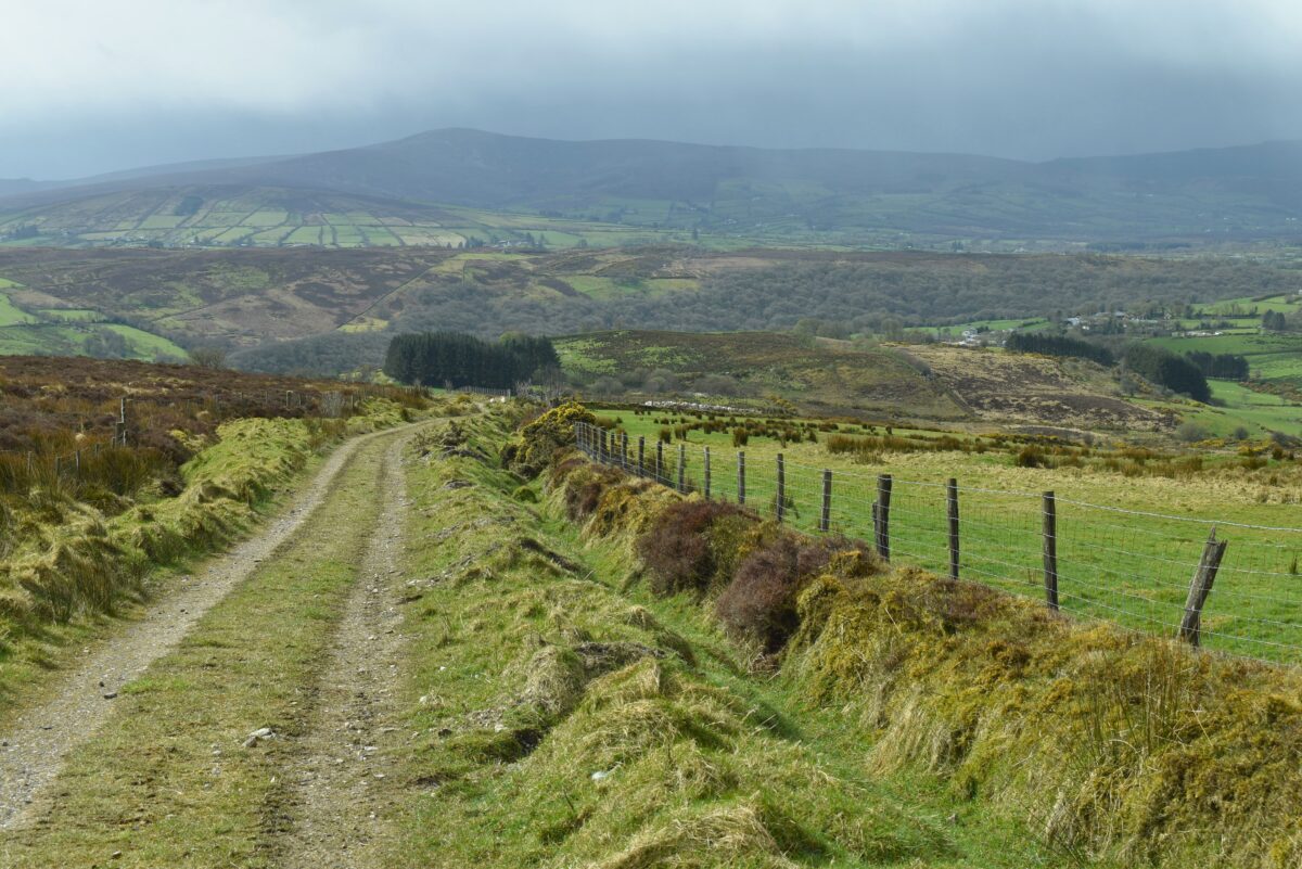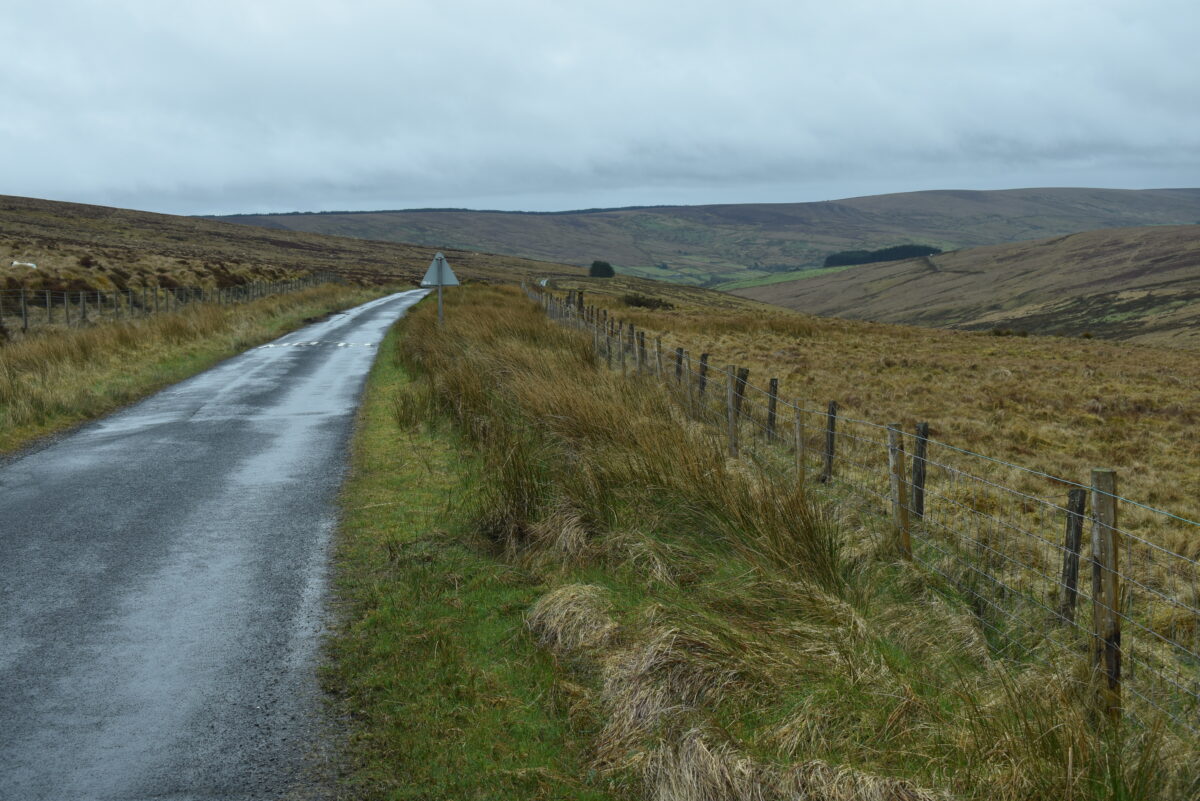 Der Wanderweg heißt “Vinegar Hill Loop” und führt durch den zentralen Teil der Sperrin Mountains, ein Bergland, das zwar nicht allzu hoch ist (maximal 678m), aber dennoch eine echte Gebirgslandschaft darstellt. Die Sperrins bedecken eine recht große Fläche von etwa 0,5 Saarland (ca. 1200 qkm) und sind, bis auf wenige Einzelhöfe und kleinere Streusiedlungen, in ihrer Kernzone nahezu unbesiedelt. Die Täler verlaufen in der Regel von West nach Ost, die Hauptstraßen auch, und wer quer dazu fahren möchte, hat nur wenige schmale Bergstraßen zur Verfügung, wie hier die Barnes Road zwischen Park und Cranagh.