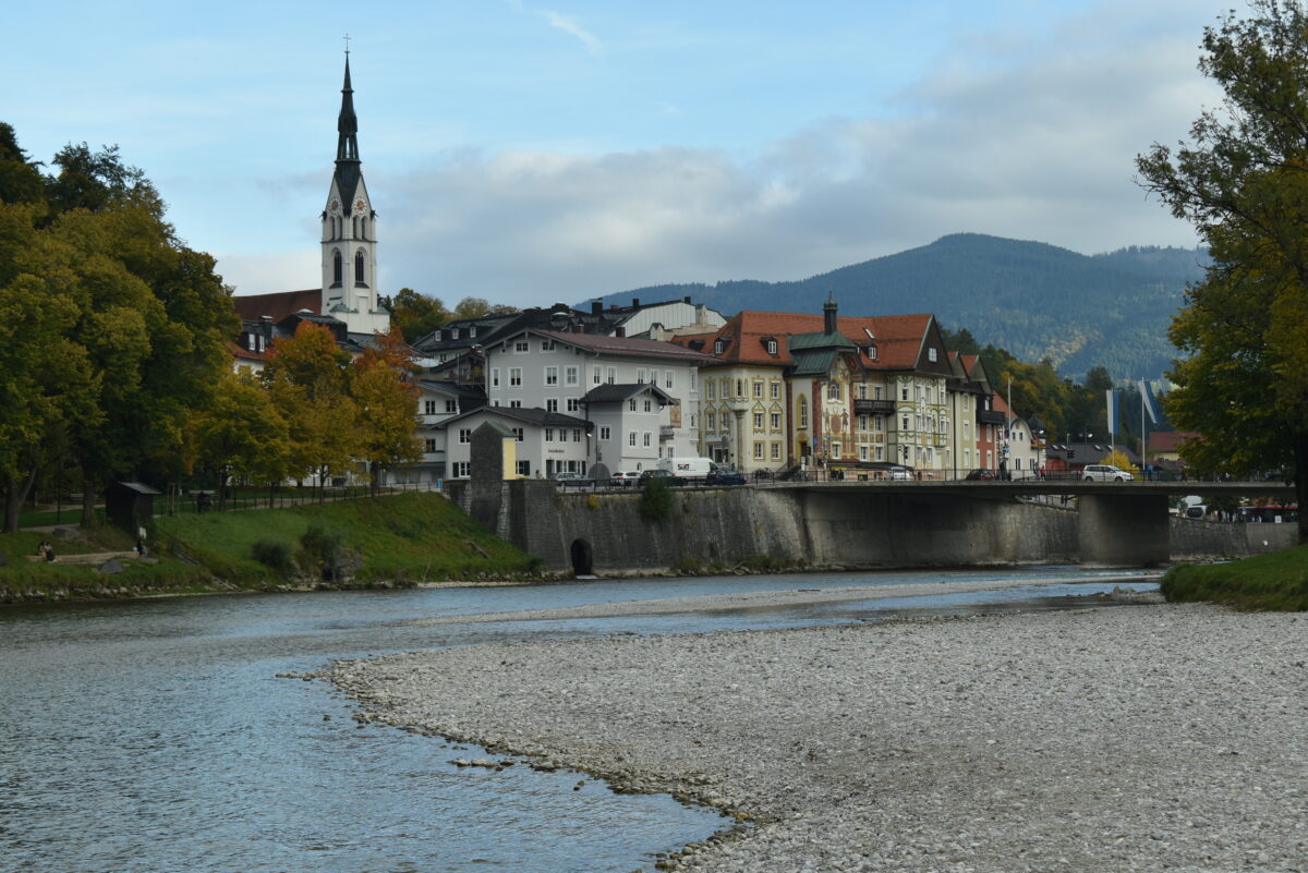 Bad Tölz liegt mit seiner sehenswerten Altstadt an der Isar, die sich hier durch ein breites Tal schlängelt und große Kiesbänke bildet, jedenfalls wenn der Wasserstand vergleichsweise niedrig ist. Auf denen kommt man dem Fluß dann sehr nah, und man hat auch einen schönen Blick auf die Tölzer Altstadt.